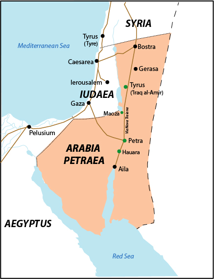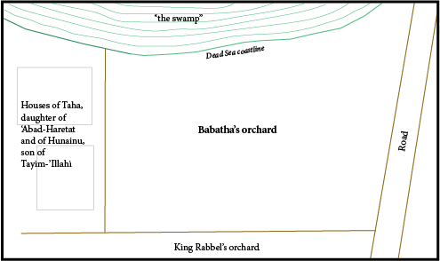 One scroll in the Babatha Archive, (P. Yadin 3), records in Nabataean Aramaic the purchase of a date-palm orchard by the Judean, Shim'on ben Menahem, in December 99 CE. The property is described as located in the village of Maḥoz 'Eglatain (Maoza) with "its boundaries to the east, the road; and to the west, the houses of Ḥunainu, son of Tayim-'Illahi, and the houses of Taha, the daughter of 'Abad Ḥaretat; and to the south, the orchard of our Lord, Rabb'el. the King, King of the Nabataeans,..., and to the north, the swamp," the latter seemingly referring to the murky Dead Sea coastline (Fig. 2). The purchase included the date-palm orchard along with its irrigation ditches and its assigned watering periods, "half of one hour on the first day of the week." (translations from Esler 2017:247). The perenial stream that flows through Wadi Hasa is the likely source of irrigation water for Babatha's date-palm orchard and other crops in the village of Maḥoz 'Eglatain (Maoza).