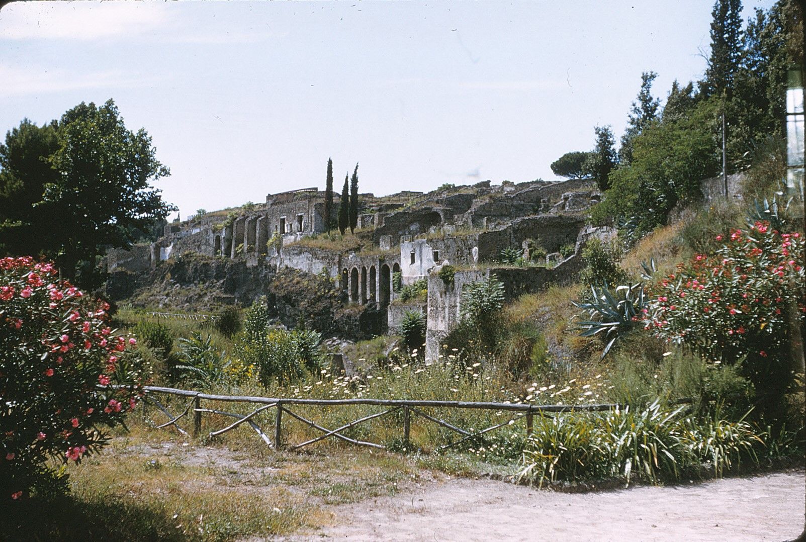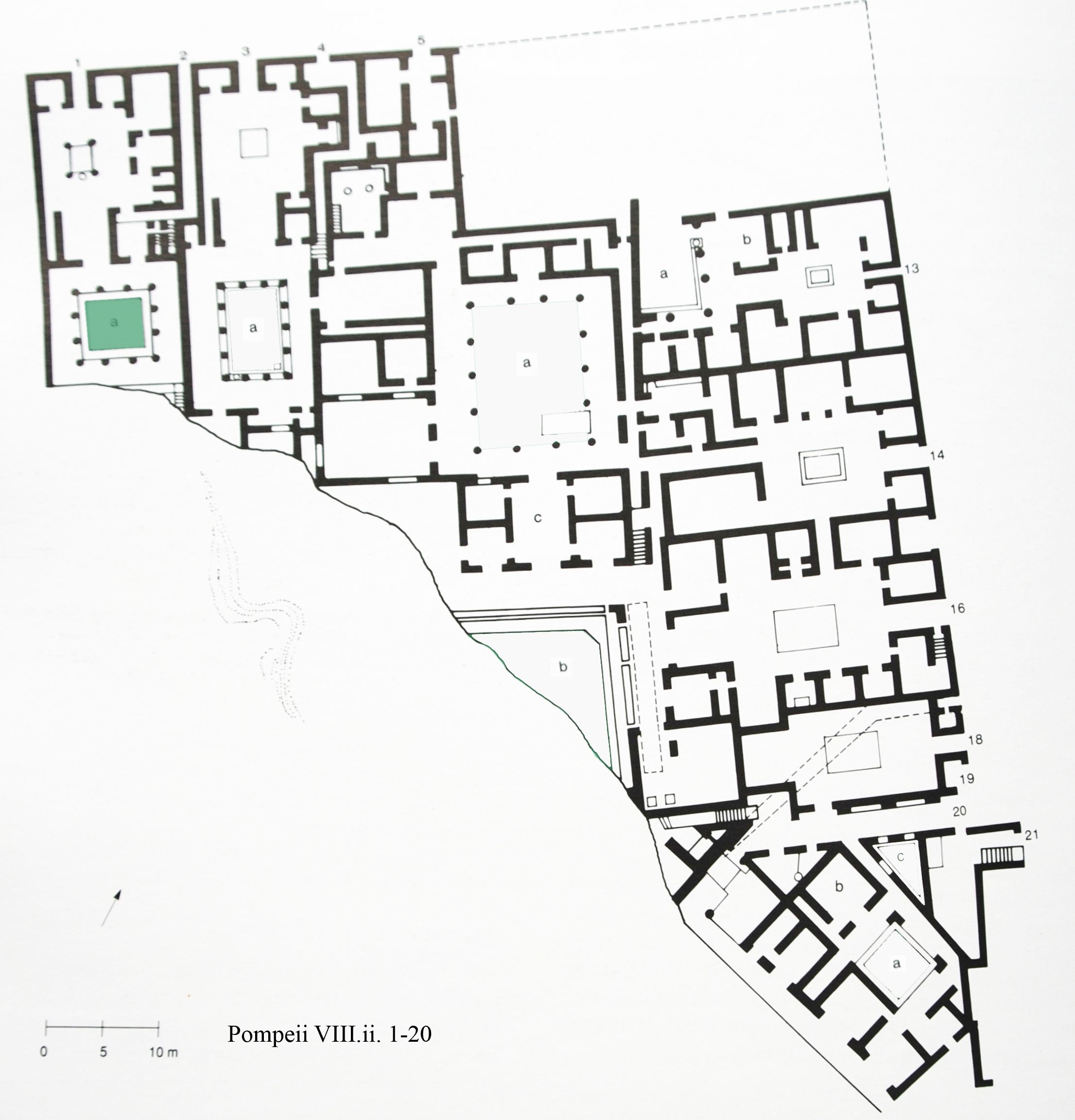 This house was excavated in 1799 and to the rear of the tablinium there was a portico which enclosed an area surrounded by a gutter. Openings were cut in the floor where the twelve supporting columns stood to allow light into the rooms below in the volcanic ledge. Mazois and Fiorelli labeled this area a hanging garden because of this configuration. A grand view of the Bay of Naples and the mountains could be enjoyed from the terraces on two levels in this house, and potted plants and shrubs may have been placed there.