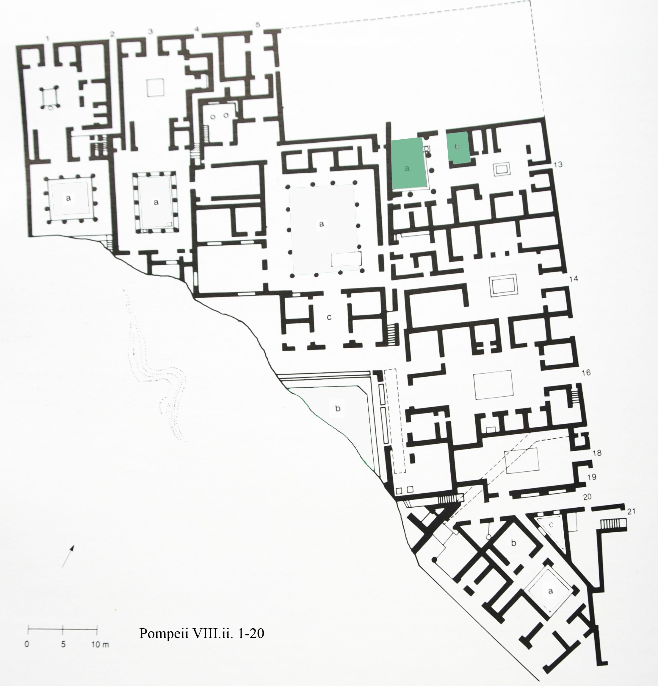The room (b) to the east had a good view into this garden (a) which was located to the rear of the tablinium. A column supported portico bordered the garden on the east and south.