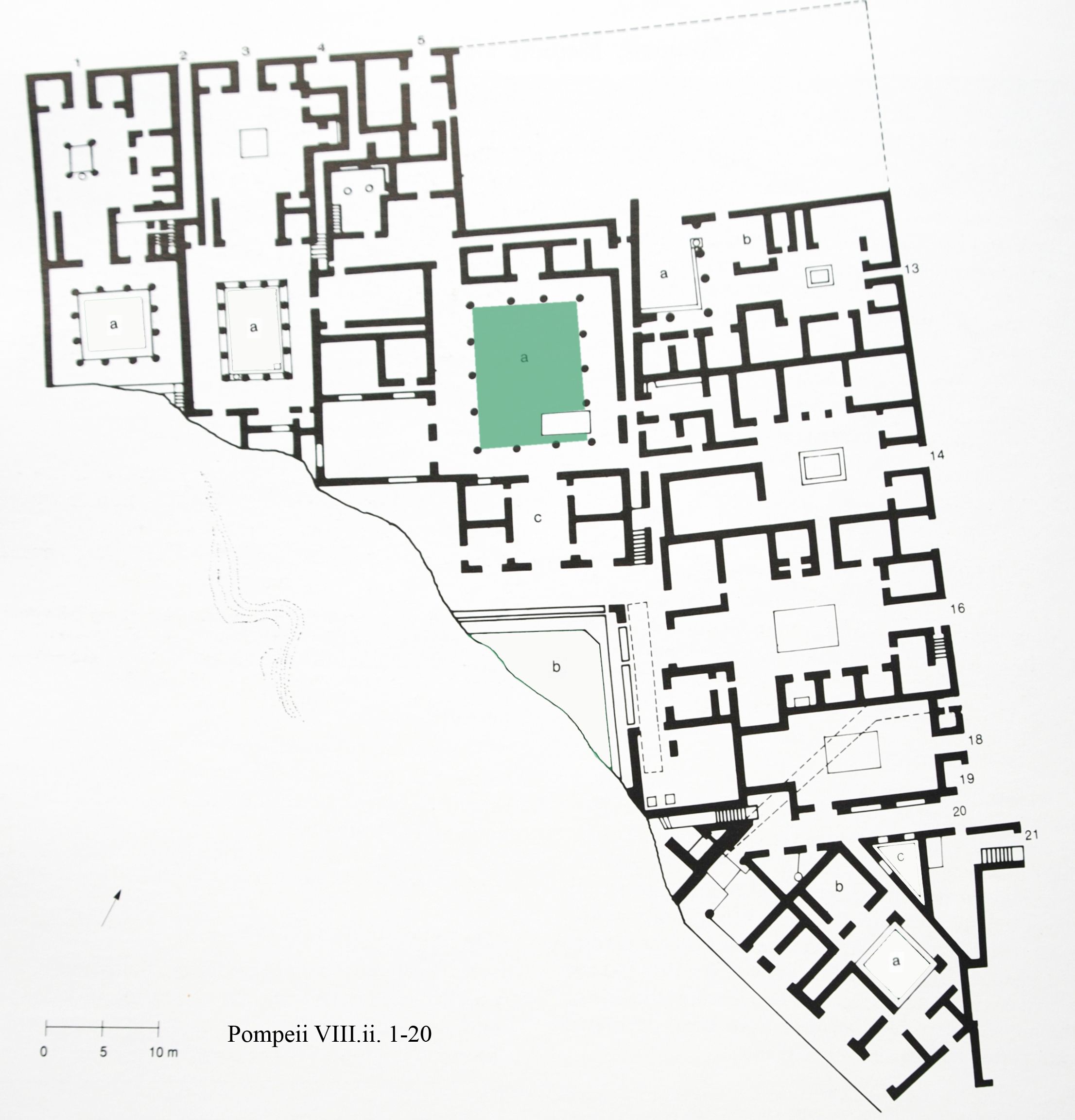 A. The volcanic ledge that this peristyle garden (a) was built on dictated an irregular shape to the portico that enclosed it. The portico had fourteen columns and a rectangular pool in the south-east corner. The west wall of the pool had fourteen small amphoras (30 cm. long; mouth 9.5 cm. wide) arranged in a row of nine on the bottom with a row of eight above. The east wall of the pool had a single row of eight. These provided shelter and spawning places for fish. A possible garden ornament, a tondo (Mus. Naz. inv. no. 121 612), was found in the house. The traces of a garden painting were reported in room II on the lower level by Noack-Hartleben, consisting of a black dado with a yellow fence and foliage painted behind this. B. Built on the volcanic ledge, only a triangular segment of this terrace garden (a) with a portico on the east and north survived. From here the view of the mountains and the Bay could be enjoyed looking over a planted area that was slightly lower than the portico. There was a large light filled room (c) between the two peristyles of this house and terraces on the two lower levels that well could have had potted plants.