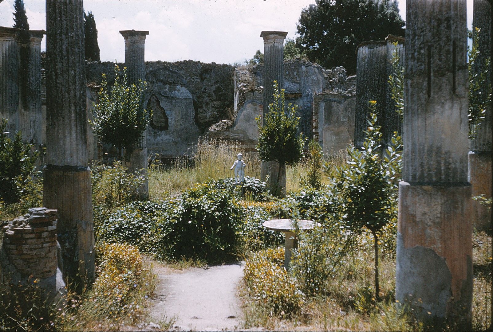 The earthquake most likely was the reason the corner columns were reinforced by pillars on this portico which originally had an upper gallery or loggia. This portico surrounded an elegant garden (a) which was excavated in 1861. The northeast corner had a wall between the columns; the rest of the columns were connected by a wooden fence. Fig. 10, 8.17.78 A water jet in the center of the garden spouted from a round marble table on a column into a pool 1.40 x 1.55 m.; 1.35 m. deep. The pool had eight iron hooks which Fiorelli suggested were for securing food items that could be kept cool by the flowing water and the shade provided by surrounding trees and shrubs. A marble monopodium was found in the northwest corner of the garden amidst the plantings. Visible across the length of the garden from the street entrance was the marble fountain statuette of a boy with a duck under his arm holding a vase in his right hand from which water cascaded down marble water steps into a channel. A channel around the perimeter of the garden caught the water that sprung from bronze pipes concealed in the columns at a height of about 1.25 m. from ground level. An excellent view of the garden could be enjoyed from the rooms on each side including the large exedra on the south, and on the southeast, the wide portico could have been used as a summer triclinium. The graffiti in this house included a notation of the purchase of sale of 200 lbs. of hog's lard and 250 bunches of garlic in July: IIX ID IVLIAS AXVNGIA P CC/ ALIV (m) MANVPLOS CCL (CIL IV. 2070) scratched on the right wall. The corner pillar of the portico counseled: MORAM SI QVARES / SPARGE MILIV (m) ET COL/ LIGE (CIL IV. 2069), if you want to waste time, scatter millet and then pick it up.