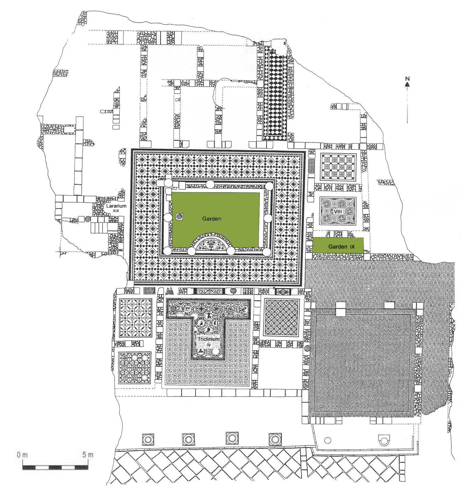 The low wall of four porticos spanned the viridarium of the peristyle (13.65 x 10.70 m), which curves to form an apse in front of the triclinium (IV) located on the south. In the viridarium there was a cistern. Access to the viridarium and cistern was provided under the north portico, between the 6th and 7th column. If the low wall had been stuccoed and painted as the columns were, there are currently no traces of painting on the viridarium side of it. Mortar channels along the north and the west of the garden collected the water from the roof and brought it to one of the cisterns located in the southwest corner of the garden. The soil of the garden has not been examined.