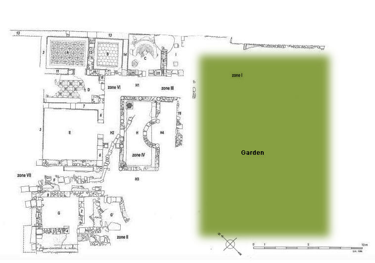 This small house (320 m²) is located on the lower part of the hill, south of the House of Marcus Aurelius. The plan is characteristic of small houses with a peristyle (Plan view, Fig. 1). The west part of the house is occupied by a large triclinium E opening onto the peristyle. Four other rooms paved with mosaics are laid on the north aisle. Surrounding the mortared courtyard H a low wall interweaves between the columns, creating a semi-circular exedra on the eastern side H4. Tis courtyard may have been planted at an earlier phase. Possibly belonging to this same house, the east part of the domus may have been a garden with a basin b in the northern corner. The house is dated from the Ist century A.D.