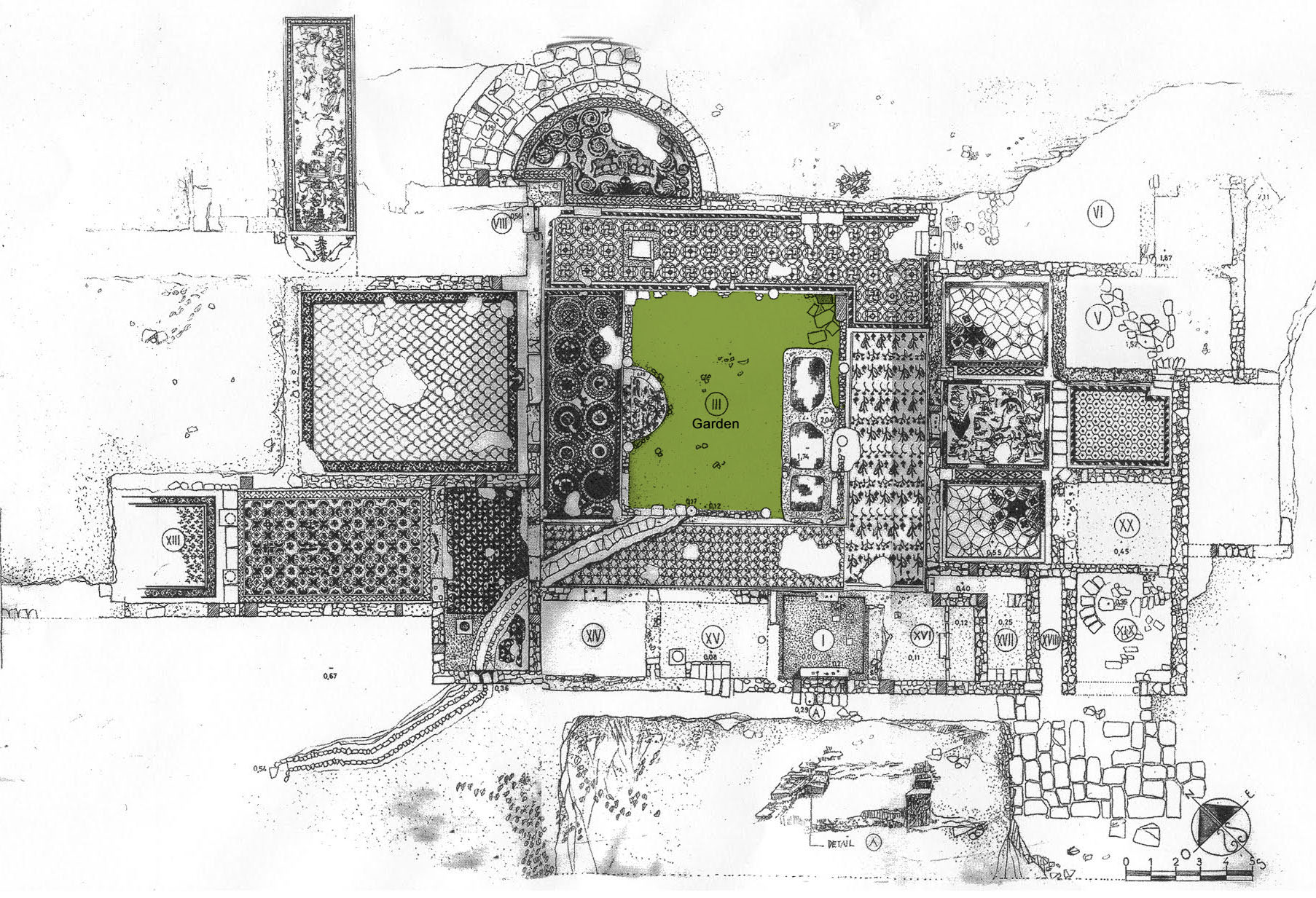 Known for its beautiful hunting scene mosaics, this large domus (1100m²) was laid out around a square shaped peristyle-garden (15.50x15m) (Plan view, Fig. 1). The low wall of four porticos enclosed the viridarium, which curves to form an apse in front of the oecus. The house was constructed on the remains of an old salt factory; the three basins located on the east side of the garden are the remains of the previous phase of the building.
