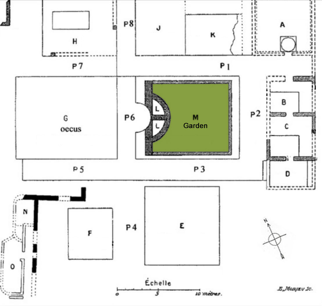 This very damaged house was laid out around a peristyle garden. A semi-circular and bisected basin was placed on the axis of the reception room (Plan view, Fig. 1). The small wall that enclosed the garden was painted with flowers.