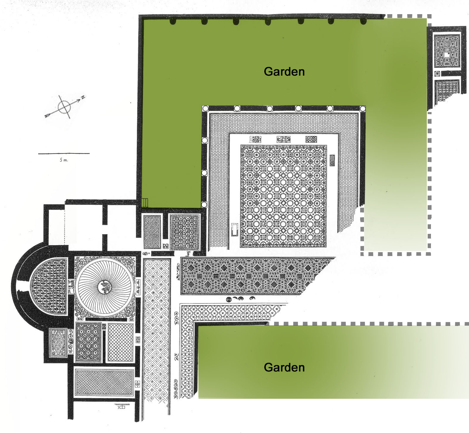 Known for its mosaic pavements, the domus of the Masks was laid out around a large peristyle that may have had a garden.