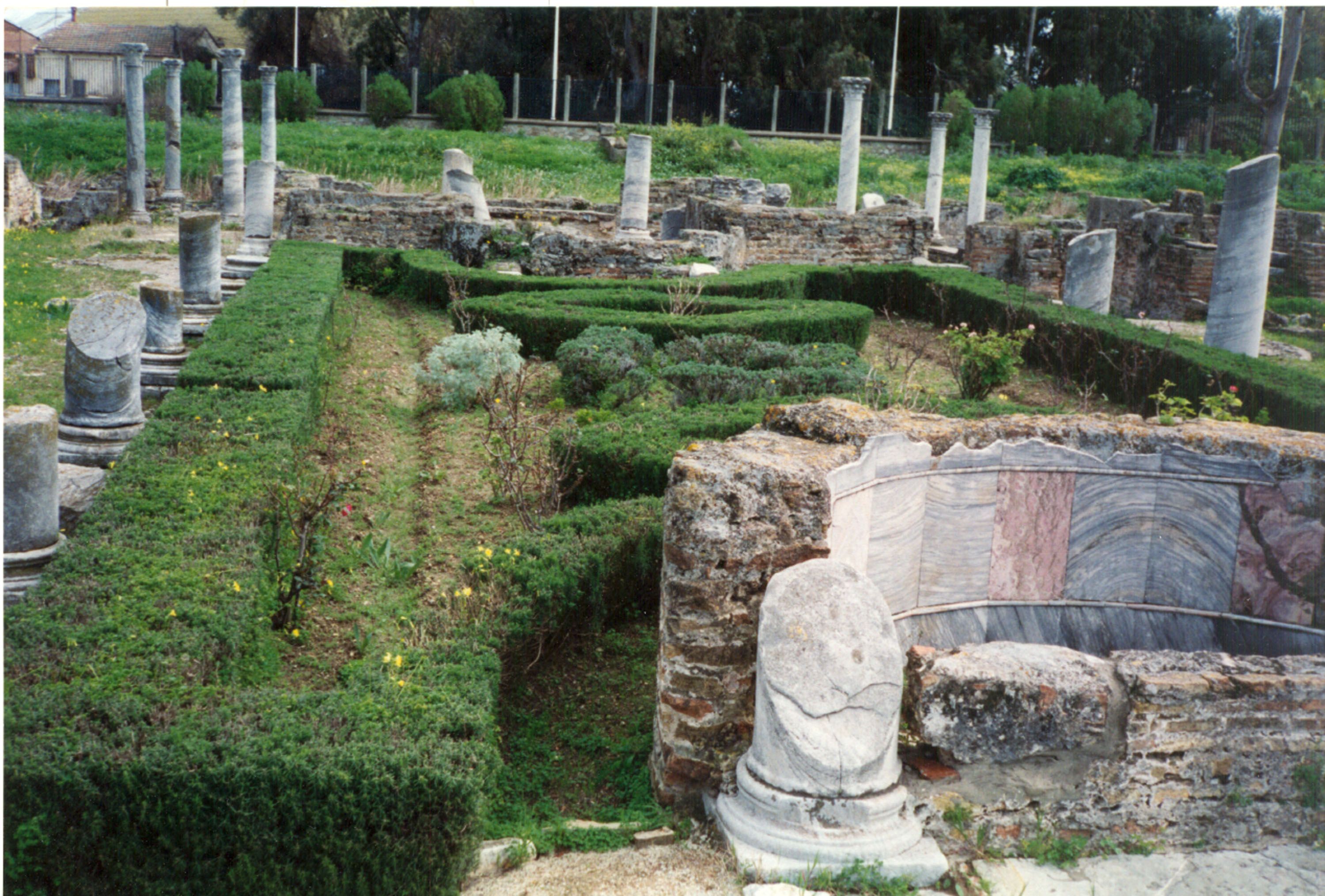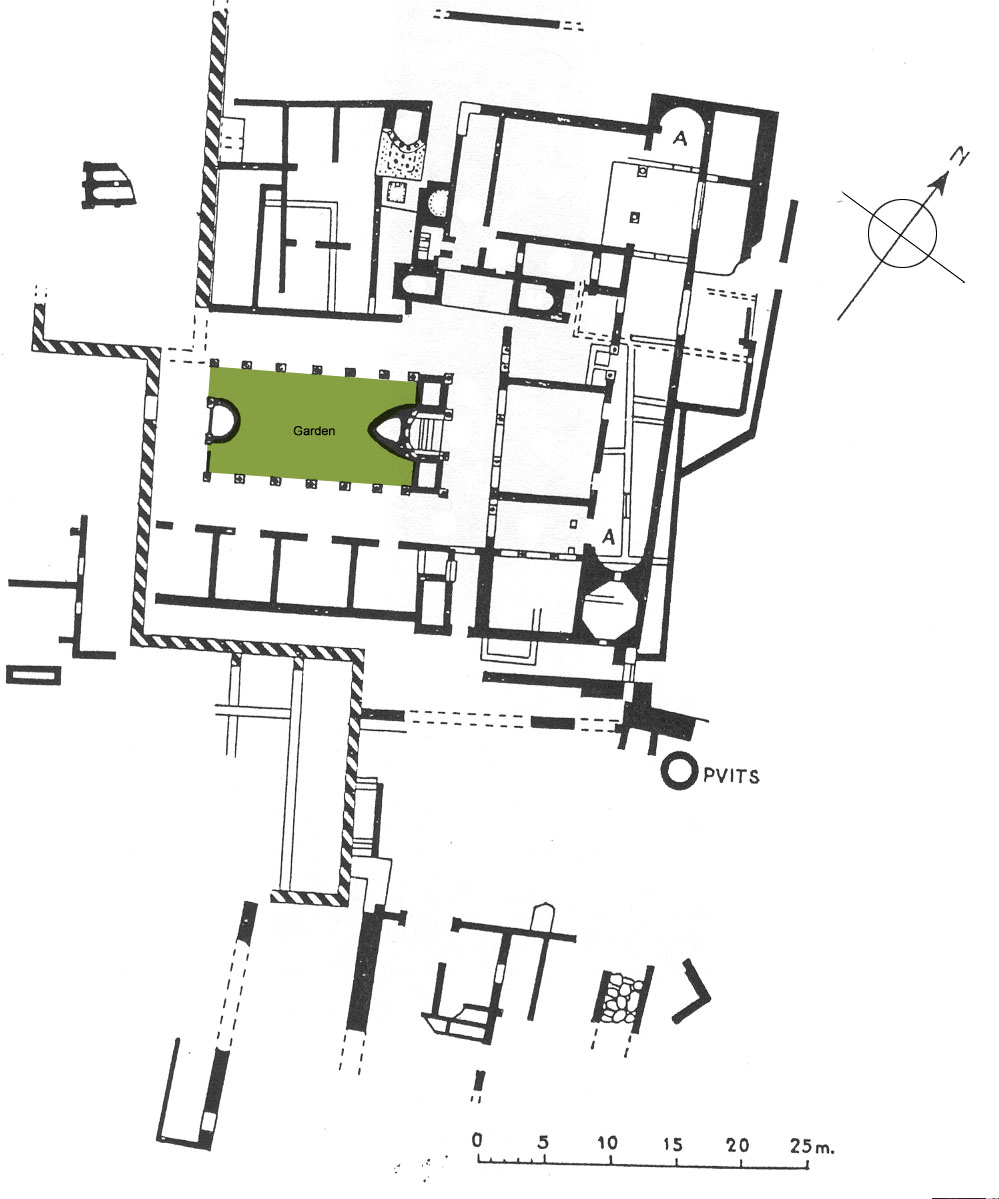 The peristyle garden of the house (ca 16.50 x 8.50 m) was enclosed on four sides by a portico supported by twenty marble columns; there was a first floor, as stairs have been found. A large oecus (B3) on the northeast side looked out on the garden. In front of this exedra was a shallow pool, framed by two columns. Behind the pool was a cistern opening covered with a stone slab; on the right and left, two square planters were added at a later period. In that part of the garden, the mosaic pavements of the lower level extended under the garden. On the opposite side, a beautiful semi-circular basin, framed by two fluted columns (now broken), and faced inside with colored marbles, was visible from the entrance of the house (Fig. 2). Between the large door and this basin, the portico was paved with white marble slabs. The open space certainly was a garden (B16) as it was planted with bushes a few years ago.