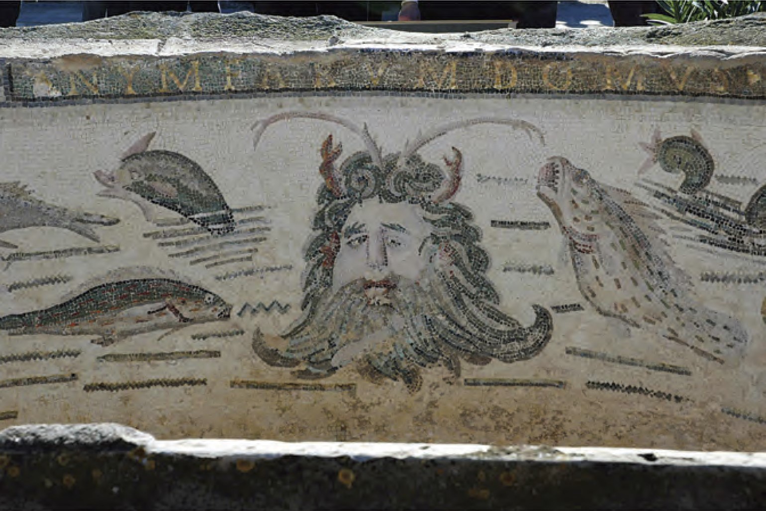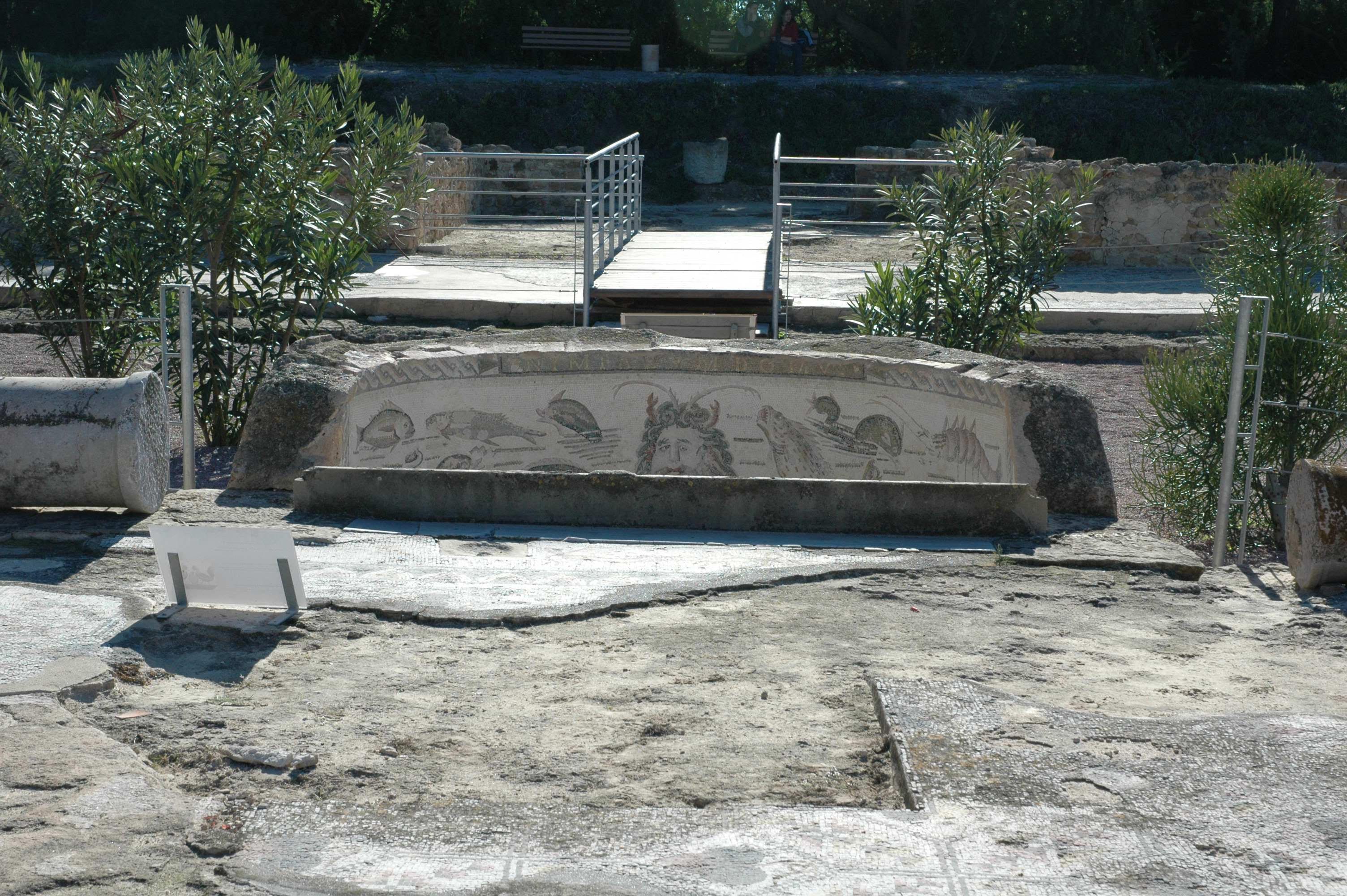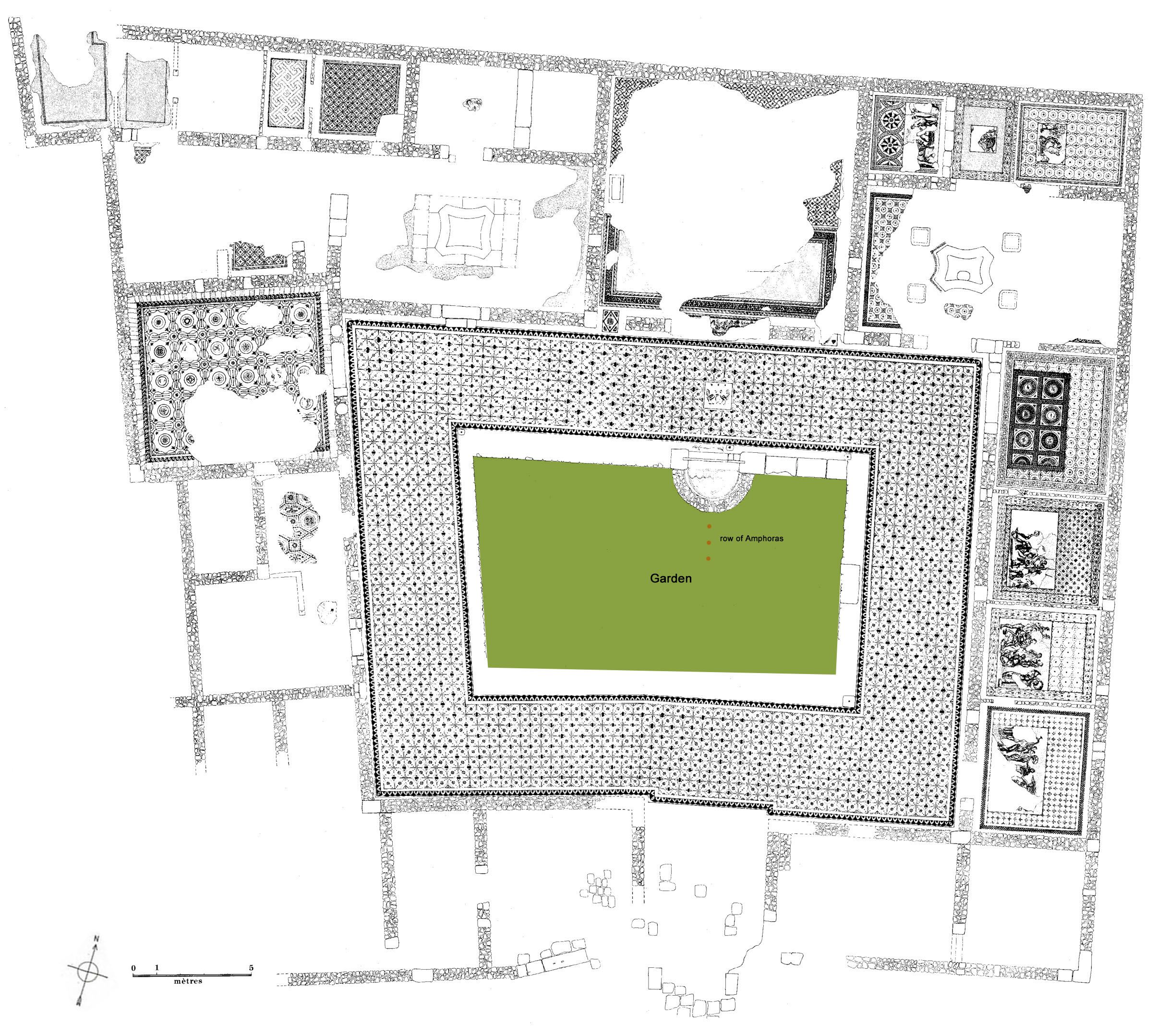 The peristyle was trapezoidal in shape (8.29 x 9 x 16. 15 m) and was bordered by 12 columns. Four porticos, 5m wide, enclosed the garden. The semicircular pool facing the oecus-triclinium, that projected into the garden was paved with a mosaic depicting a mask of Ocean among fishes and had an inscription "NYMFARUM DOMUS" quoting a passage from Virgil's Aeneid. According to the excavator, J.-P. Darmon, a row of broken amphoras that had served as planting pots were found along the central axis of the garden facing the oecus and the basin (Fig.2)