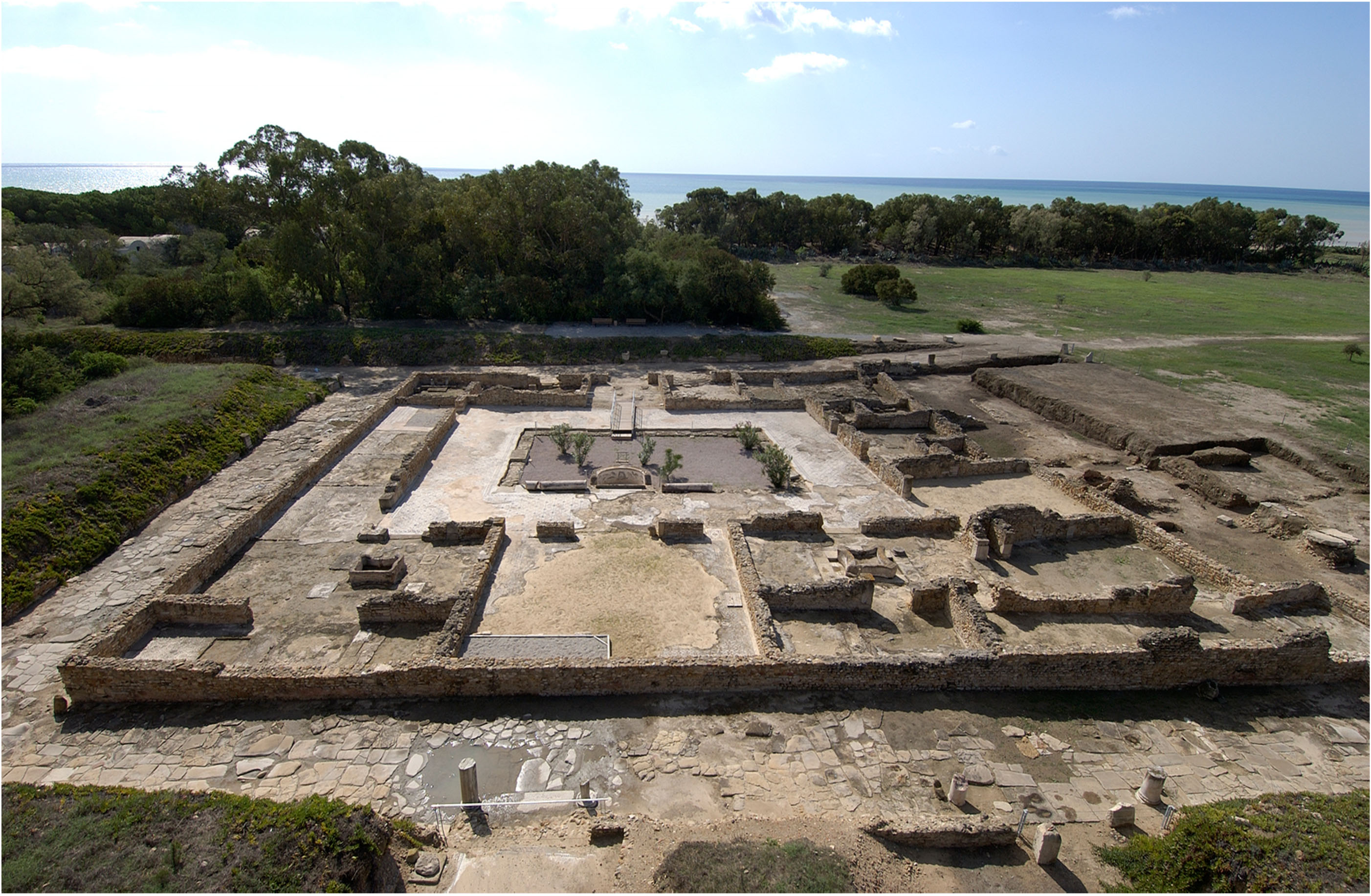 This large house (1500m²) laid-out around a peristyle-garden is known for its mosaic pavements figuring Homeric scenes. The peristyle is entered from the S. The N wing had a vast oecus-triclinium bordered on both sides by two apartments that each had two rooms and a passage to a pseudo-atrium (Plan view, Fig.1).