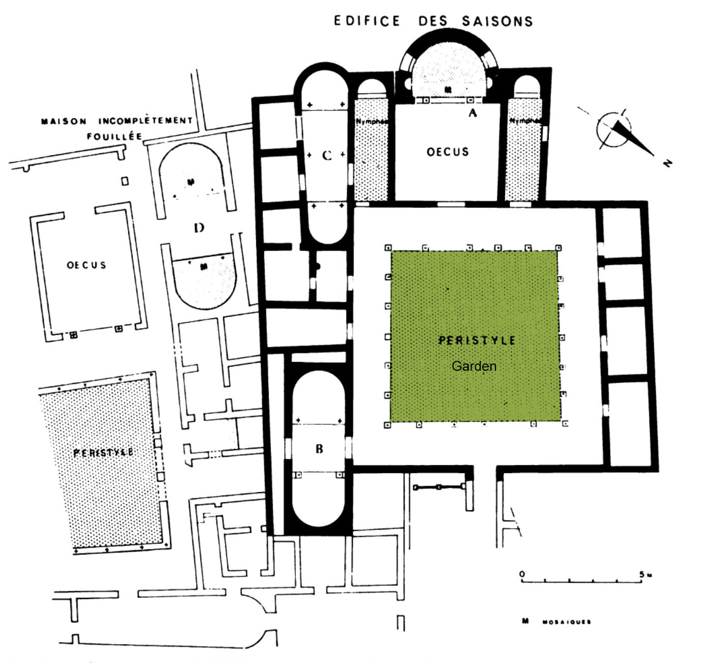 This house, known for its majestic and richly decorated oecus, is laidout around a peristyle courtyard that was probably planted. The house is dated to the late IVth. early Vth. Century (Plan view, Fig. 1).