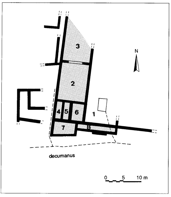 This house is also 120 southwest of the theater, in front of house A. Excavated in 1967-1968, the parcel covers 450 sq m, with a useful covered surface of 401.5 sq m. It was constructed in the second century. Only the southwest corner is known; the rest is lost or not excavated.