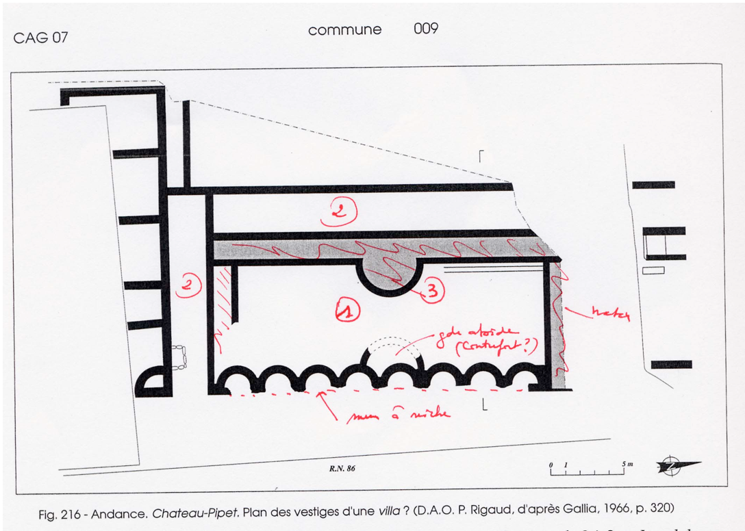 1.2 kilometers south of the village of Andance, at the place called Château-Pipet, in the little valley of the Cueil, structures belonging without doubt to a Roman villa were discovered. As early as 1867, the abbot Chaillet noted the presence of ruins in this area. A salvage excavation in 1964 partially exposed a long ornamental pool associated with these structures. A rectangular garden [1] of 152 square meters formed a part of the villa. On the east side, the garden was bounded by a an unusual wall formed by eight half silos, or, seen form outside the garden, semicircular niches. Perhaps these niches were hidden by a wall along their back side, outside the garden, for a little of such a wall remains at either end. On the inside of the garden, in the middle of this wall were the beginnings of a larger apse (shown in dotted lines on the plan). One can see in this structure a supporting wall with internal buttresses. To the west and to the south, the space was bordered by a gallery [2] ; the shafts of its columns were discovered in the excavations. Between the garden and the gallery on the west was a rectangular pool with a semicircular apse extending into the garden in the middle. This pool, about 24 meters long and 2.3 wide, was covered in opus signinum. It was perhaps completed by two arms along the other galleries, thus forming a U. On the south side were found the beginnings of five rooms, but it was not possible to excavate them. In the northwest corner of the garden, a repair was found in the form of a wall running parallel to the pool but 50 centimeters east of the garden-side pool wall. It has been interpreted as a waterproofing device: a fill of a layer of green clay was place there without doubt to stop infiltration of water [4].