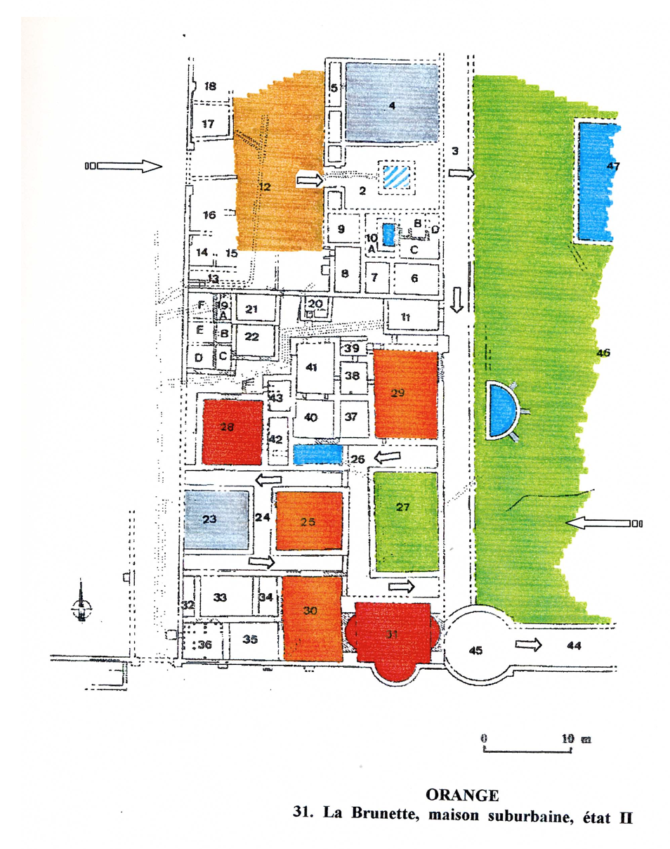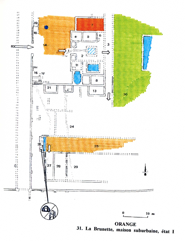 To the west of Orange, this residence is just south of the amphitheater – which was destroyed in the eighteenth century. More than 2000 square meters have been unearthed. It is bounded on the south by a fencing wall 150 meters long and on the north by road that separates the house from the amphitheater. The east and west boundaries are not known. Constructed in the first century A.D. (condition 1), the habitation was greatly remodeled and embellished towards the end of the second century (condition 2) only to be abandoned in the first half of the third century.