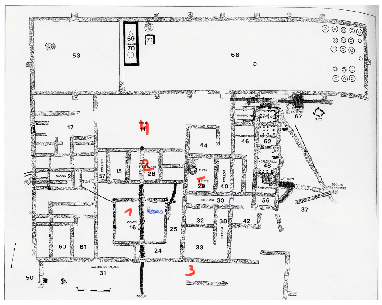 The principal buildings were constructed in the first century; in the second century, the peristyle [1] was added. The garden in it (8.3 by 6.6 meters) is surrounded on four sides by a 2.3 meter wide portico, with five columns on a side. In the garden were found trenches for planting trees and vegetables. To the south, a gallery serving as a façade runs along this peristyle. To the north, there was a square reception room [2] (4.5 meters on a side) later embellished by the construction of a large bay on its garden side. The bay was framed by two columns more massive than the others of the portico that supported a pediment and lifted the roof of this portico above those of the rest of the peristyle. To the west, a structure in the corner formed no doubt a tower and belvedere overlooking the sea. To the east of the peristyle, a second courtyard, [5] had a well whose rim was the top of a dolium. Further to the east was a bath wing (50 by 30 meters). North of the reception room was an open-air courtyard [4] 8.3 meters wide, and beyond it, the storage area for wine in casks occupied a large area 52 meters long and 12 wide.