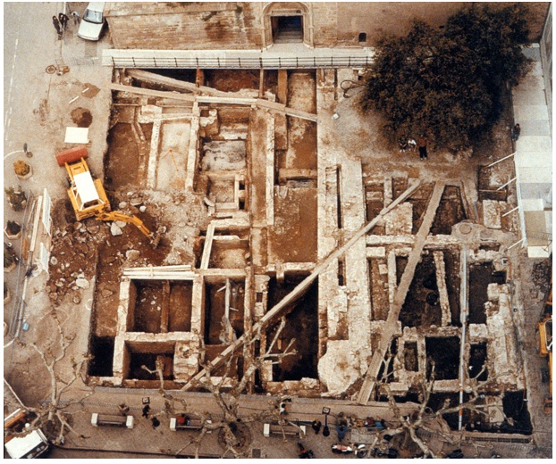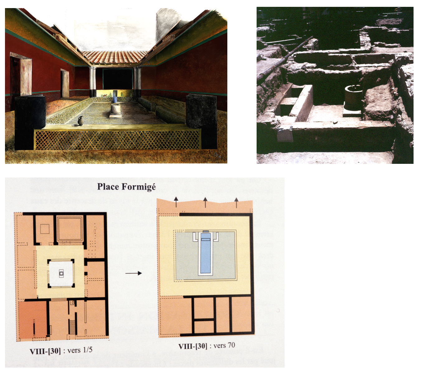The house found under Formigé square lies 200 m south of the intersection of the cardo maximus and the decumanus maximus at 150 meters from the quays of the port. It is in the southwest quarter of Insula A of the network of the city. A parcel of 462 square meters has been recovered with a useful covered surface of about 342 square meters. To the south it is paralleled by a decumanus and by other habitations to the north and east. The principal entrance was probably on the south. What may be called the first stage of construction, though it replaced a previous condition, seems to go back to around A.D. 1-5. In this condition, it was occupied until A.D. 60-70. Its pavements have been preserved, along with a large part of its painted decoration up to a considerable height.