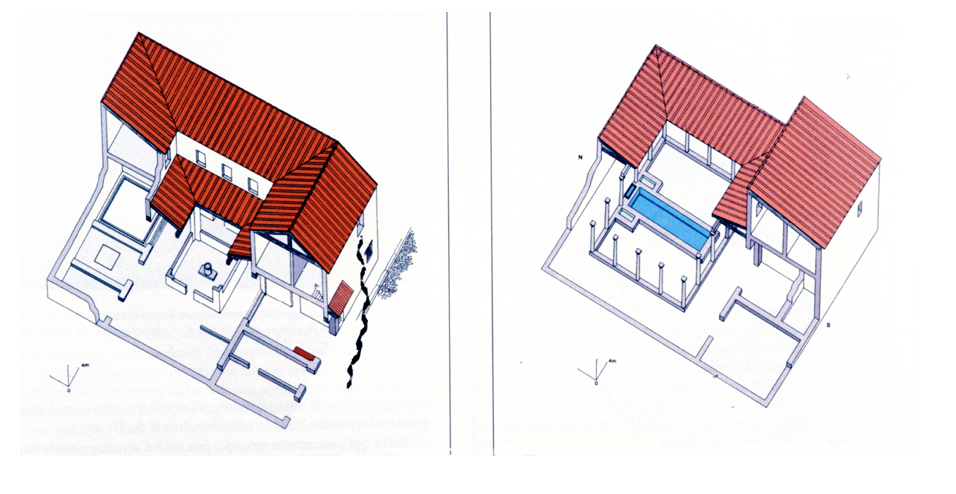 One enters the house on the south from the edge of the street by a wide entrance with a floor of pounded earth, which accommodates a bench. At the end of the vestibule, there is an atrium [2] of 9.2 by 10.54 meters, around which the house is organized. The impluvium was surrounded by low walls on which an imaginary garden was painted. In a second phase, nine planters filled with earth were arranged on three sides of the impluvium.