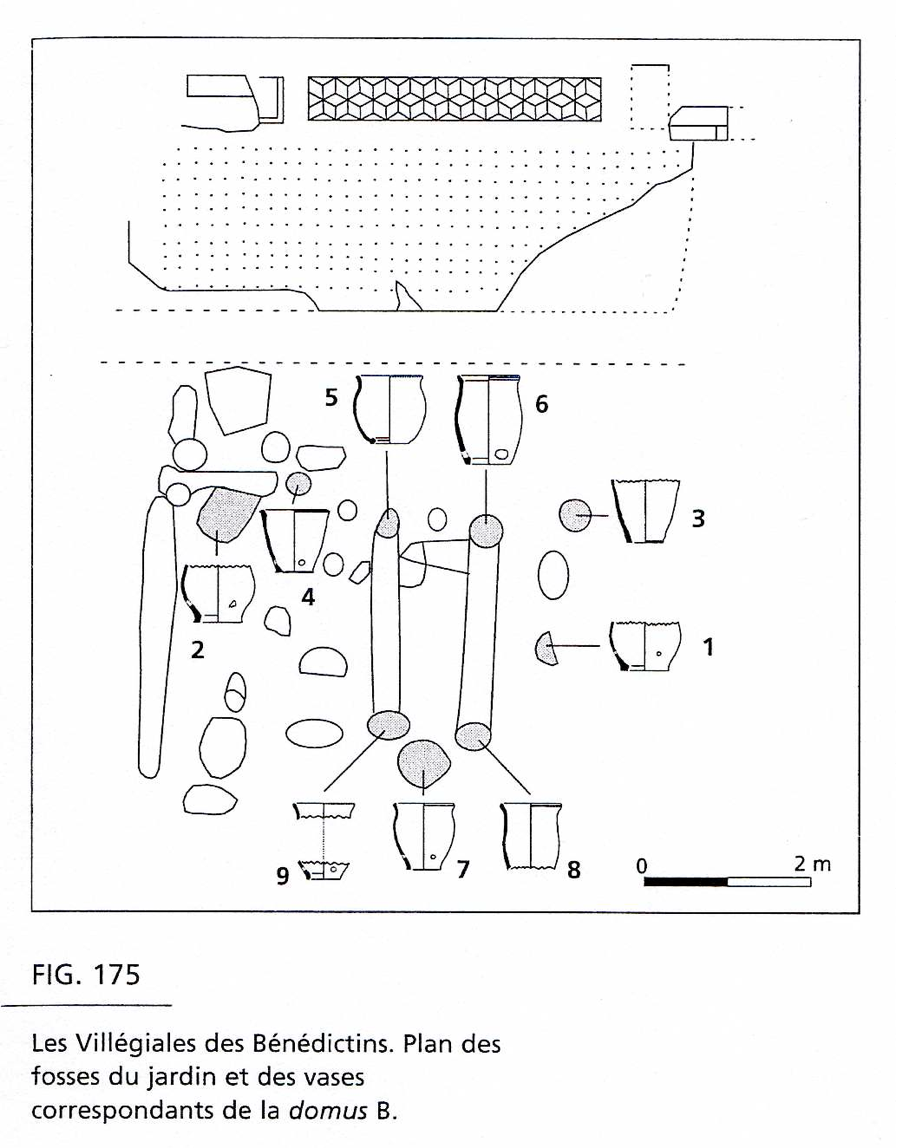 At the south of the garden there is a well which may have supplied the house before the connection to city water was installed; it could also have been used to water the garden. The absence of ceramic material in the ditches makes precise dating of them impossible, but the general context suggests a date in the first century A.D. for the establishment of the garden. A dump dug in the garden allows dating of one of the principal phases of occupation of the building to A.D. 60 to 90.