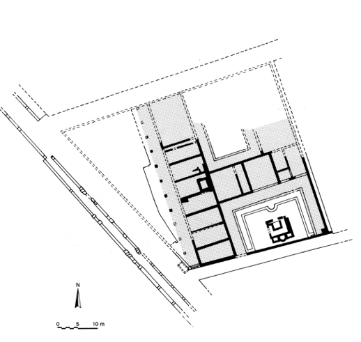 The house had a linear plan starting from a garden on the south, then on the north side of the garden, a façade gallery, then several rooms, and finally a peristyle on the north. It went through three phases with the changes concentrated on the south garden. In the first phase, this garden [13] (23.5 x 11.5 m) was bordered on the north by a portico [12] 2.5 meters wide. In the garden, adjacent to this portico and directly in front of the principal reception room [8] was a rectangular pool (7.5 x 4 m) with an apse in the center of the south side. It probably had a fountain.