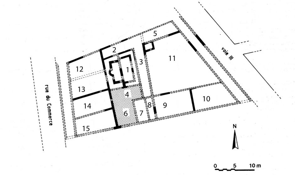 This house was destroyed to build the market and lies under it, but it is partly visible through glass plates in the floor. It was occupied approximately from 60 to 140. The lot covered 947 square meters and has two façade porticoes, one on the rue du Commerce and one on Voie III. The house was arranged around a central trapezoidal courtyard [1] (roughly 7,50 x 6,50 m) which may have been a garden. There were porticoes on only the north and east sides [2 and 3]. They had pounded earth floors; their black and green painted columns give the house its name. A one-meter wide channel pool ran around the north, east and south sides. Later, this pool was made shallower and its bottom covered with a concrete containing calcite crystals. A rectangular pool (5 x 2 m) with an axial apse of 1 meter closed the U-shaped channel pool on the west. A single cutting pot was found during the excavation.