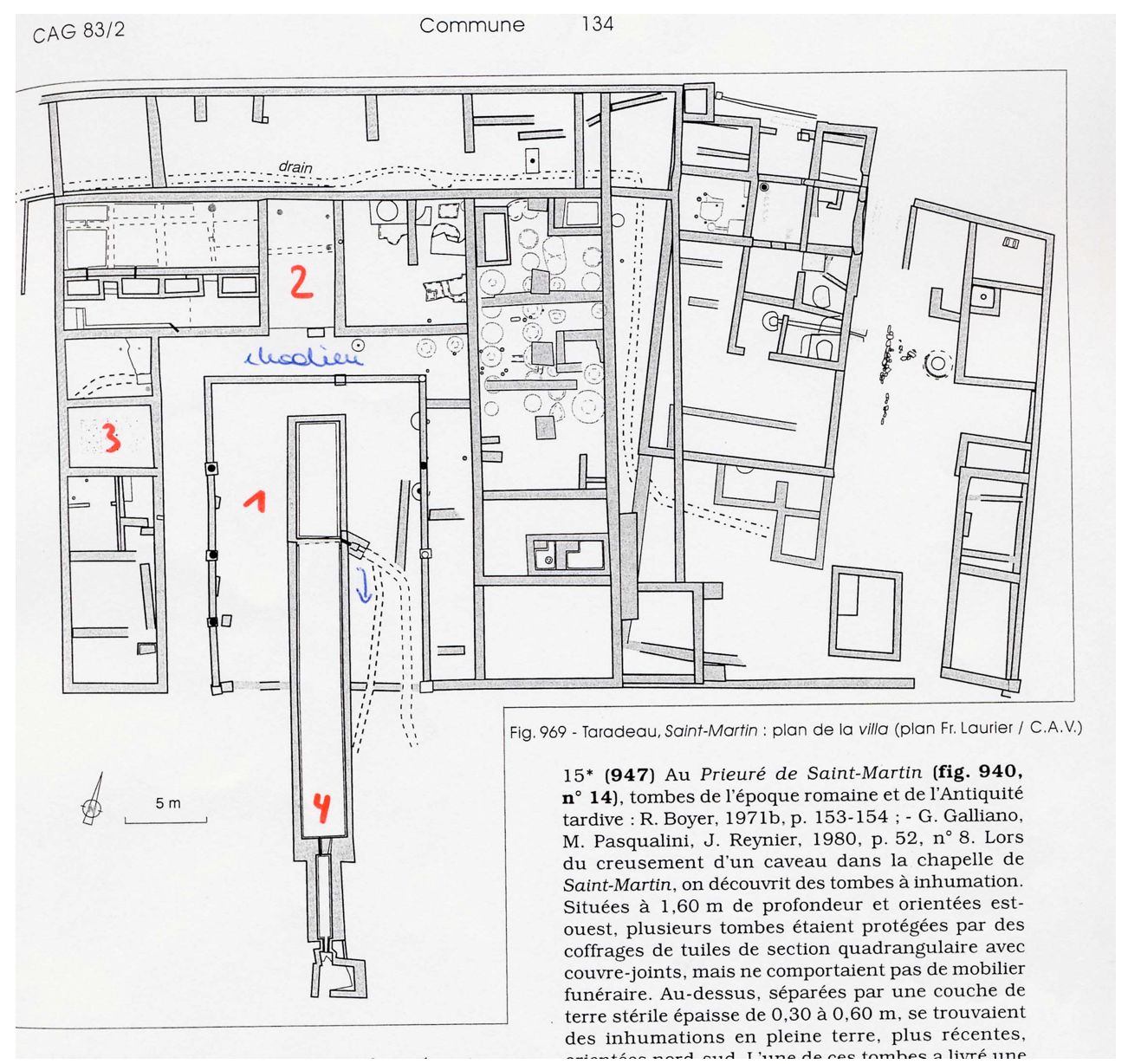 Taradeau lies about thirty kilometers west of Fréjus in the valley of the Argens between Les Arcs and Lorgues. The Gallo-Roman villa sits at the foot of the hill of Saint Martin, at an altitude of 70 meters, some 750 meters north of the Argens. It was excavated from 1994 to 1999. This villa with a Roman wine press was occupied from the first century B.C. to seventh century A.D.. In stages 1 and 2, it was a farm, which was then remodeled into a villa (stage 3) in the last years of the first century or first half of the second. The former farm became the agricultural part, while a new pars urbana was created. It was organized around a garden [1], 34 meters on a side, surrounded on three sides by a U-shaped, 2.3 meter-wide portico with columns. In the center of the garden was an ornamental pool (7.2 by 2.8 meters and 1 meter deep) lined with opus signinum with an overflow drain to the exterior of the south enclosing wall. It is presumed that the villa was supplied water by an aquaduct. Around the pool, cuts into the substrate have attested the planting of trees or large bushes which would have embellished the interior of the garden. The northern portico, of the Rhodian type – that is, with higher columns than the other three – opened onto a main room [2] (7.6 by 3.6 meters) which is centered in the axis of the pool. To the west, a triclinium[3] (5 by 3.5 meters) had a floor paved in opus signnum decorated with marble plaques indicating the placement of the three couches.