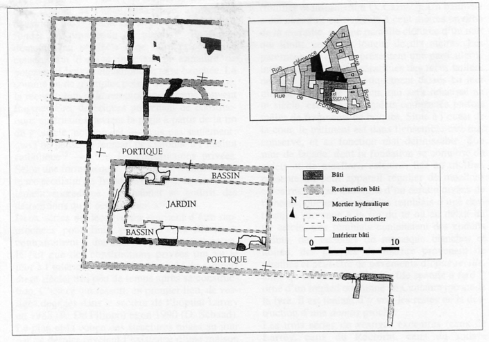 The Hôtel d'Assézat is a Renaissance palace which now houses the art collection of Georges Bemberg. In the heart of Toulouse, it is about 150 meters east of the Pont Neuf, in rue de Metz. After original finds in 1979, further vestiges of a domus came to light during salvage excavations in 1993-1994 in connection with expansion of facilities. After a first phase dating from A.D. 1-15, of which remain some painted plaster found in the trenches, there developed in the reign of Tiberius, between 15 and 30, a residence with rooms ornamented with carefully executed mosaics. They were organized around a courtyard for household work, as indicated by a fireplace and a sinkhole for waste water. The surface was tamped earth repaired three times – to judge from the surviving strips – with a new layer of clay.