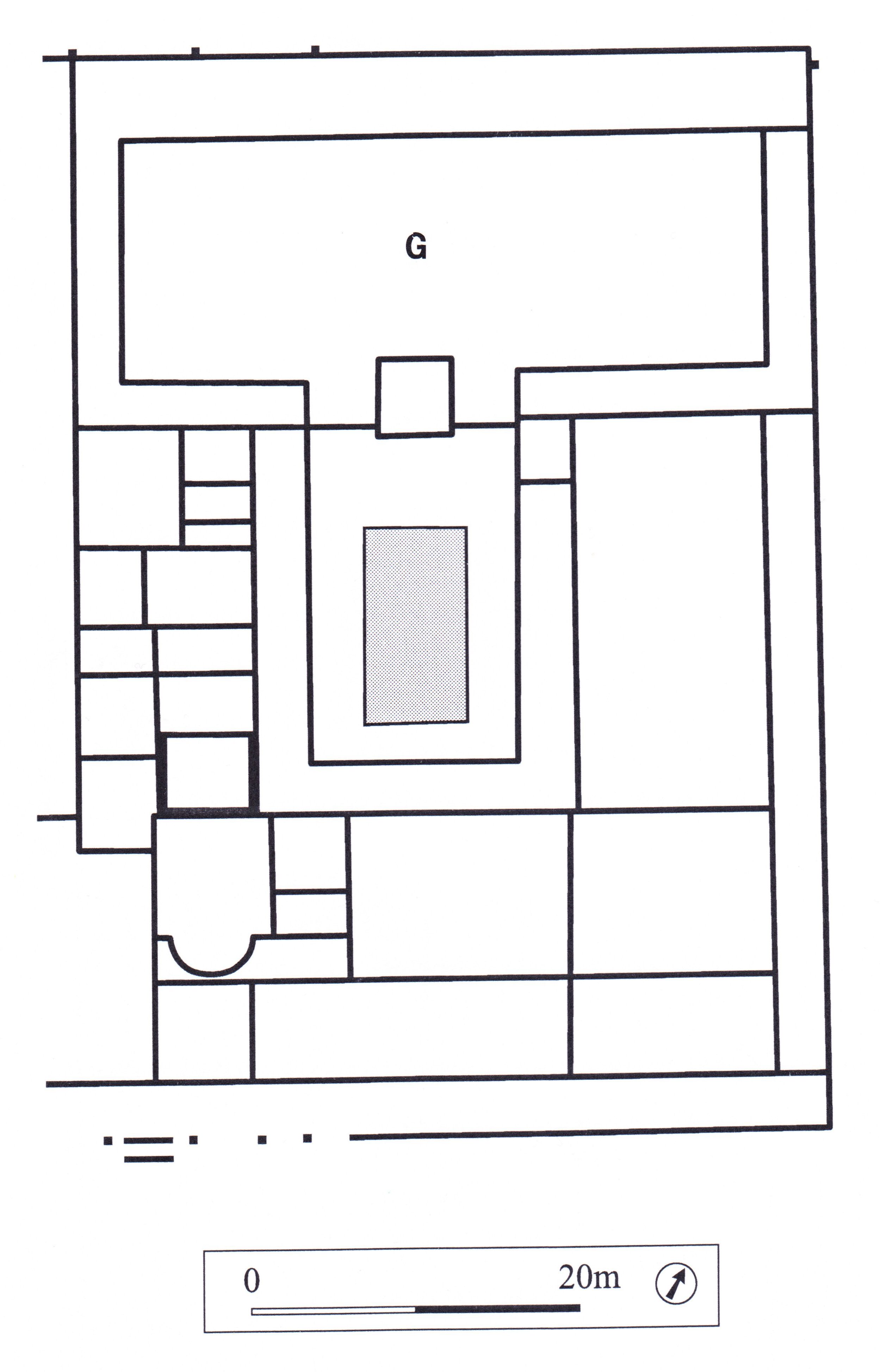 The most remarkable feature of the building was a T-shaped garden courtyard (G in Fig. 1) surrounded by a peristyle on all sides (Fig. 1). A ground line gutter ran around the edge of the courtyard. In the southern part of the garden was a large pool paved with limestone slabs and measuring 6 x 12 meters On the northern edge of the pool was a rectangular fountain. To the north of this was a square structure measuring 5.40 x 5.40 meters which may have been a garden pavilion.