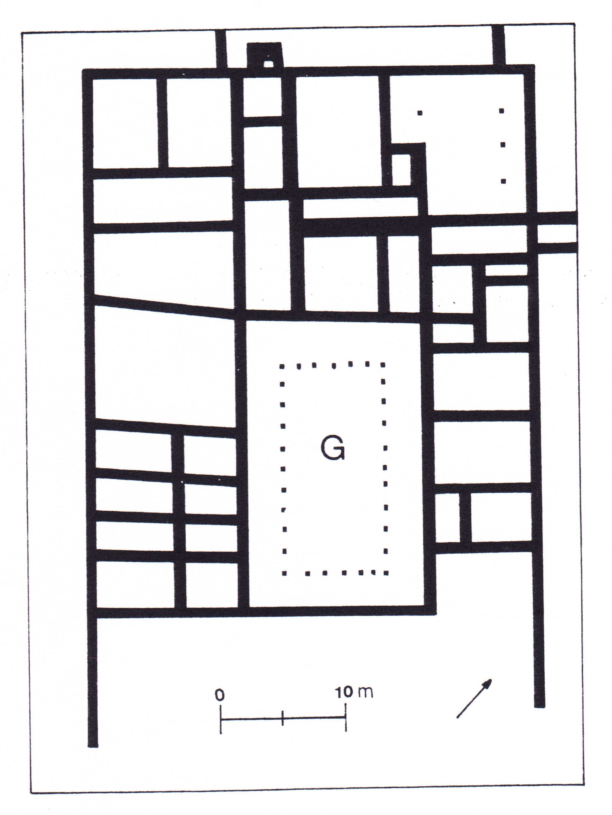 In the middle of the insula was a large peristyle courtyard which may have been planted (G in Fig. 1). In the southwestern part of the building complex taverns and shops opened onto the colonnaded street.