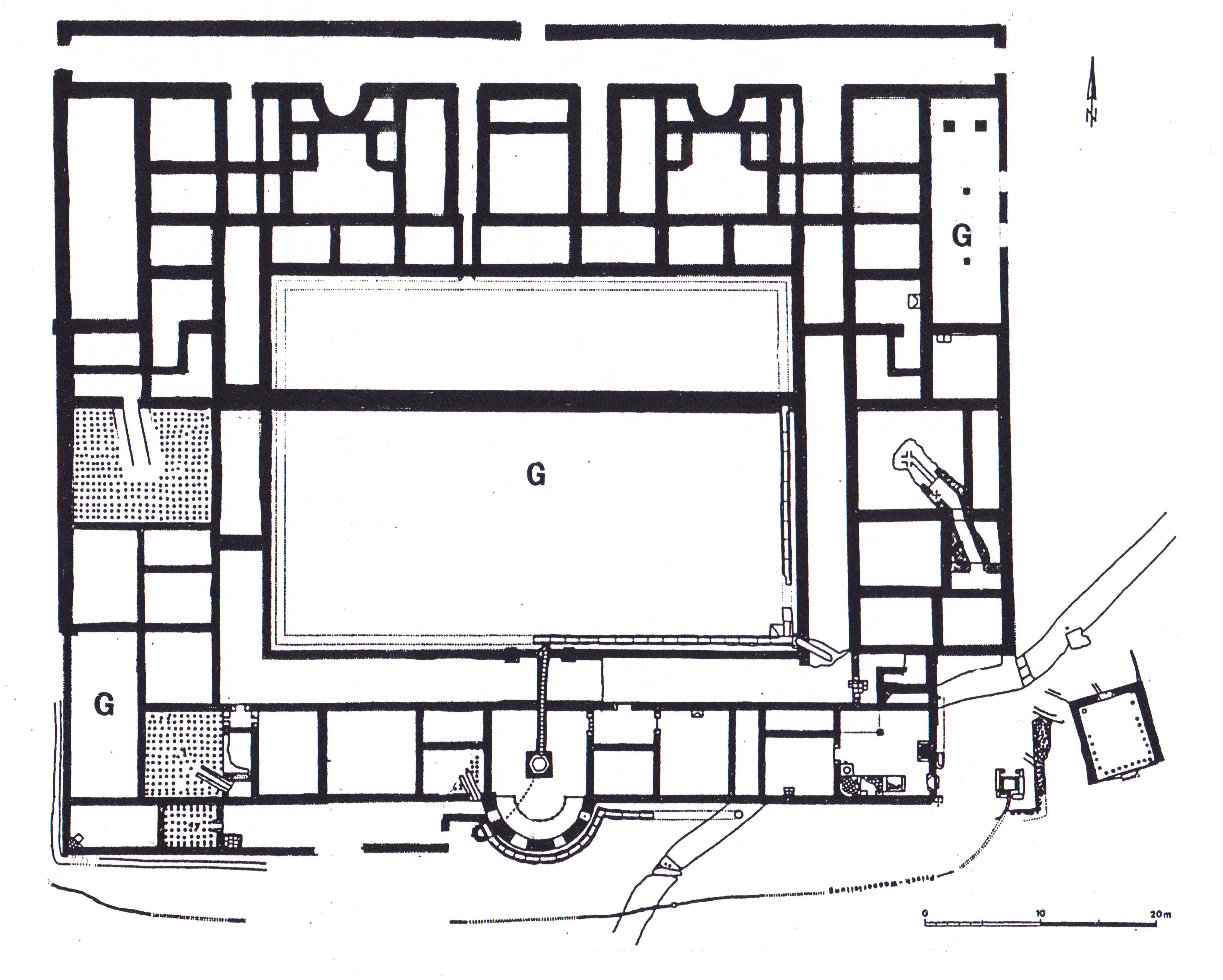 The three-storied villa with more than 50 rooms on the ground floor alone, many decorated with mosaics and imported marble revetment, was centered on a colonnaded garden courtyard (G in Fig. 1). Many of the sandstone columns from the peristyle, as well as fragments of sculpture from the garden, were found in the courtyard. The house was built into a hill, and the courtyard was terraced on two levels. Around the edges of the garden was a ground level gutter. From the apsed triclinium on the south, with a mosaic floor and a marble fountain in the middle, there was an excellent view of the garden.