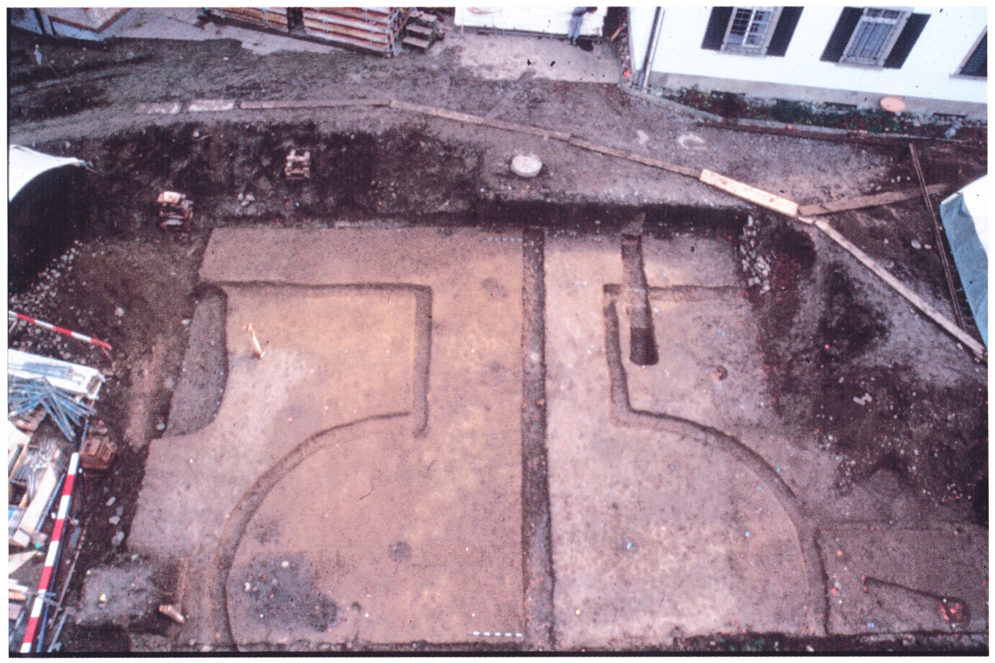 In the residential part of the farm (pars urbana) was a large corridor villa with two protruding wings enclosing a courtyard area on three sides. This area was planted as an ornamental garden in the mid-1st century (Fig 2, G in Fig. 2). On either side of the central path, garden zones were bordered by bedding trenches, 20-25 centimeters deep and 20-40 centimeters wide. The line of plantings flanking the path are curved to form two niches (Fig. 3). In Dietikon, digging of planting trenches would have been necessary because the massive layers of construction debris deposited to level this area for the building would have hampered a successful growing of garden plants. The archaeobotanical analysis of several soil samples revealed little of relevance, but box hedges have been suggested as the vegetation in the bedding trenches, forming a low living edge to these formal garden beds, and possibly climbing plants such as ivy along the porticoed façade. Shallow pits in the plots surrounded by the hedges may be the remains of bedding pits for trees or shrubs. A timber pergola in the courtyard ran parallel to the northeast wing of the house. To the west of the courtyard garden was a timber-lined pool fed by a stream, interpreted as a fishpond. Bedding trenches for hedges surrounded it.
