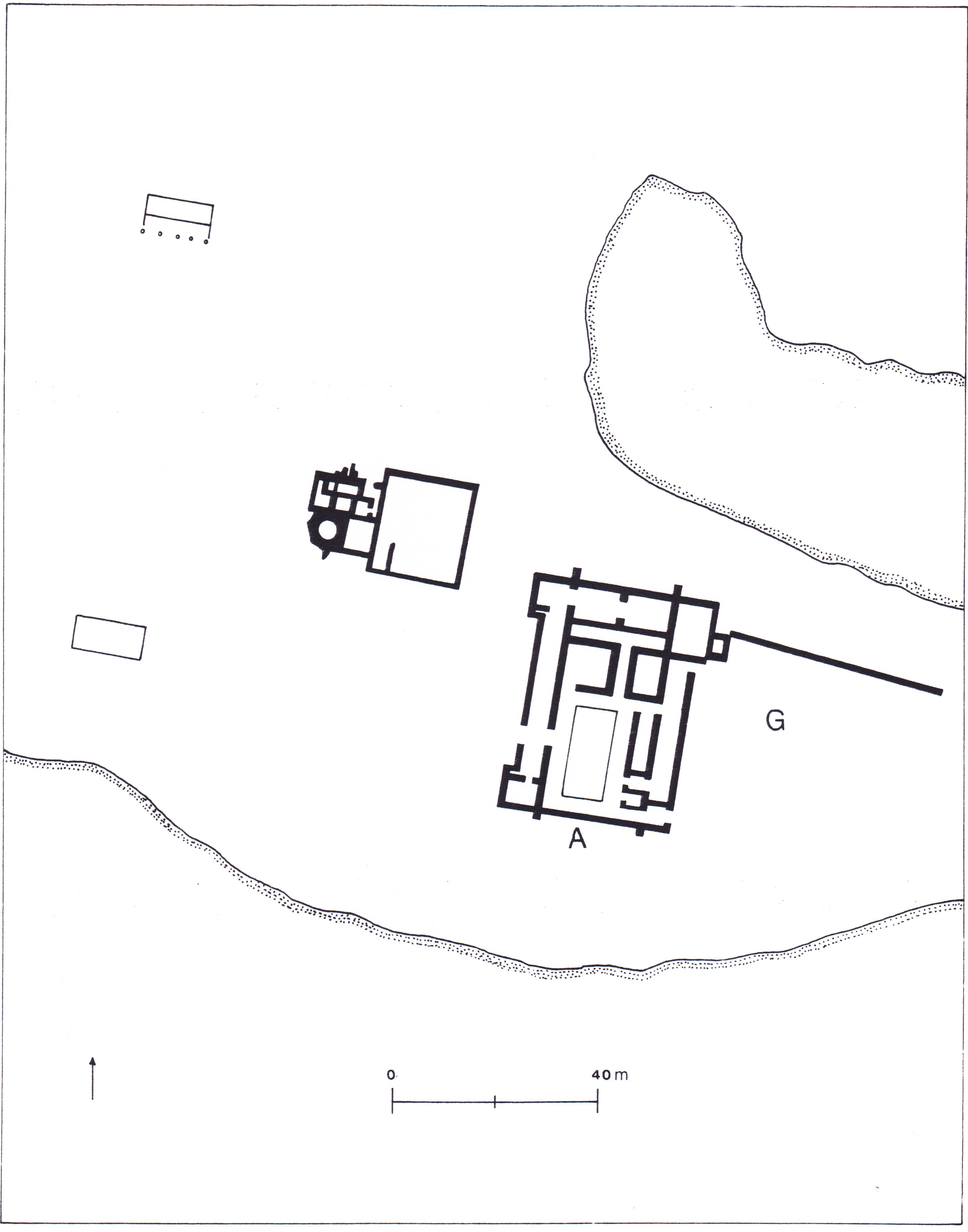 The house of this villa rustica was of the winged corridor type (A in Fig. 1) with a porticoed facade (Fig. 1). Attached to the eastern end of the house, measuring 37 x 46 meters, was a wall running east-west which has been interpreted as the protective wall of a garden (G in Fig. 1).