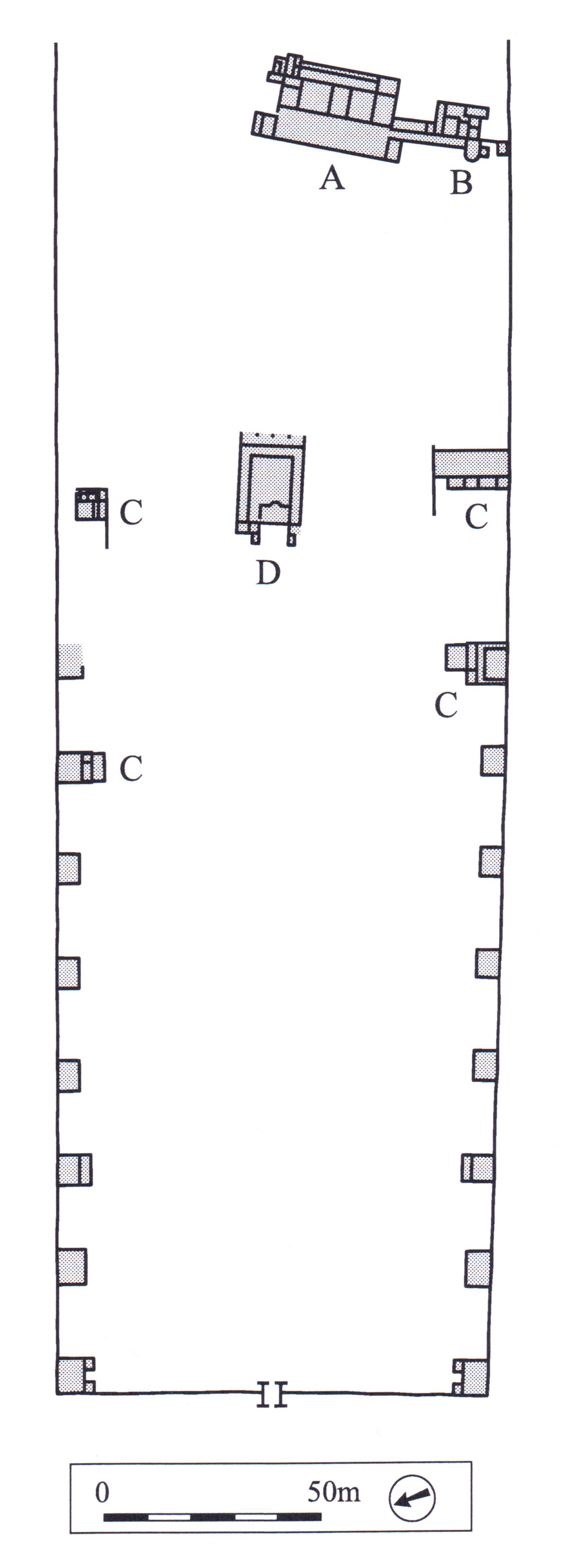 The enclosed area of this villa rustica was 160 meters wide and at least 460 meters long; the eastern limits of the complex have not yet been found. The main residence and bath complex (A and B in Fig. 1), dating to the beginning of the 2nd century, stood on sloping land eight meters higher than the rest of the farmyard. At the eastern end of the service area (pars rustica) was a large peristyle building with a nymphaeum at the western end (D in Fig. 1). The open courtyard within this peristyle may have been a garden. Small kitchen gardens have been reconstructed between the various outbuildings and smaller houses (C in Fig. 1) in the pars rustica. Gardens here are possible, but it remains a matter of speculation whether these areas were actually planted.
