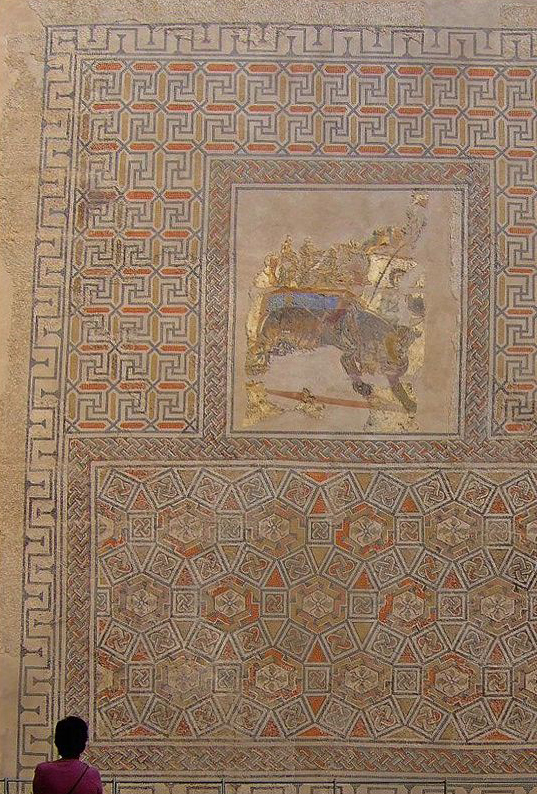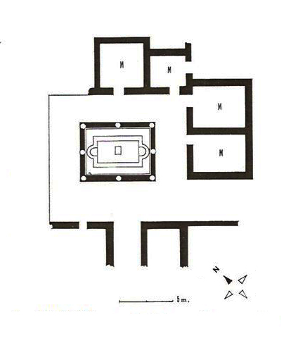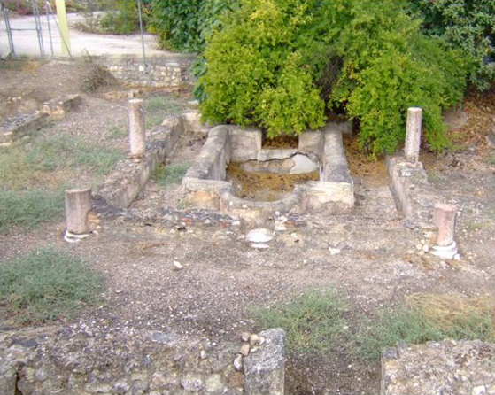 Excavations identified two building phases in the villa. The early Imperial phase of the villa contained a peristyle courtyard with a pool, central drain and possibly a garden. During the late Imperial phase (fourth century AD), the pool was converted into a double fountain with two semicircular exedras on its short sides, which housed sculptures of Mithra and Dionysus. The space which may have been a garden was transformed into a second pool around the original one by paving it and building a low wall at the base of the peristyle. The ruins show this second state.
