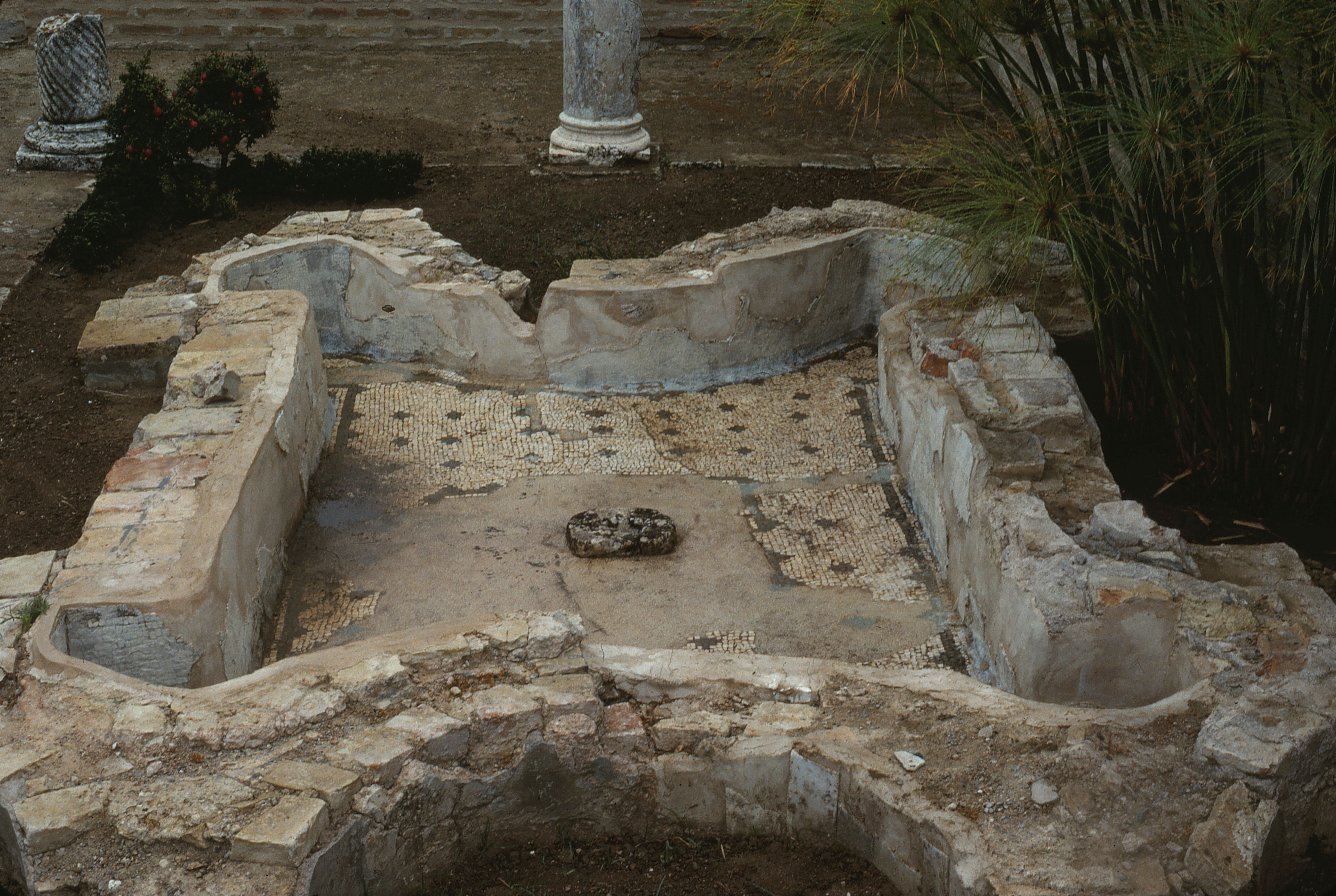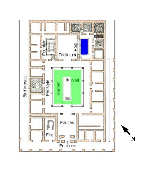 To the left of the entering guest was the reception room with an interesting mosaic of the birds, each bird in its own square. Straight ahead, behind the peristyle, was a large triclinium with a good view of the garden. Moreover, beside the triclinium and presumably visible from it through a window was a small garden with a peristyle of two columns on two sides and four on one side. Most of this garden was occupied by an ornate pool with semicircular extensions at the corners. On the other side of the triclinium was another pool with long steps descending into it suggesting that it was for swimming. It was surrounded by a patio. Opening onto this patio were five rooms with mosaic floors. To the visitor's right on entering the garden from the southwest were found traces of a niche with a mosaic pavement above which had once been the lararium.