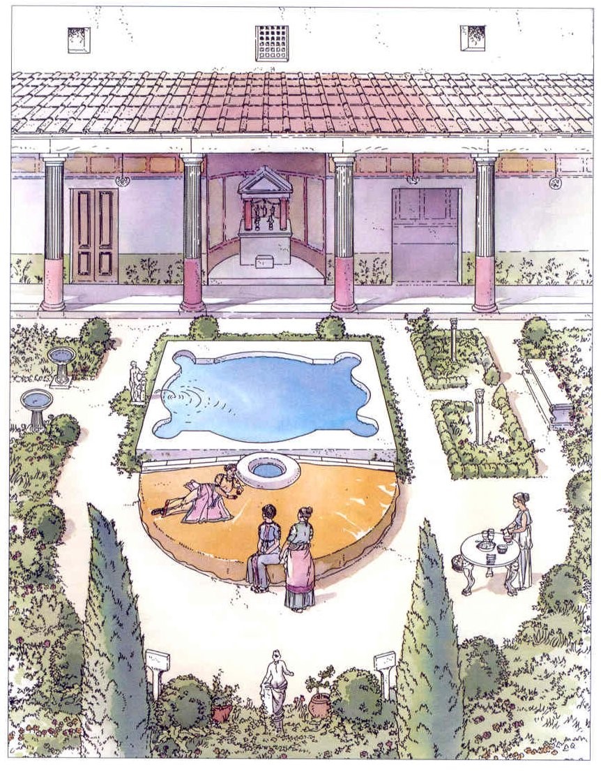 This house, in the area southeast of the House of Hylas, had a peristyle garden that, even in its poor state of preservation, can be theoretically reconstructed, as done by Blázquez and drawn by F. Riat.