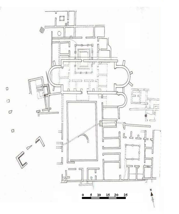 In the first phase several features, such as the bases of the four buttresses along the western edge, and the semicircular structure in the middle of the large courtyard, were established. Fragments of oil lamps datable to the second century AD were also found.