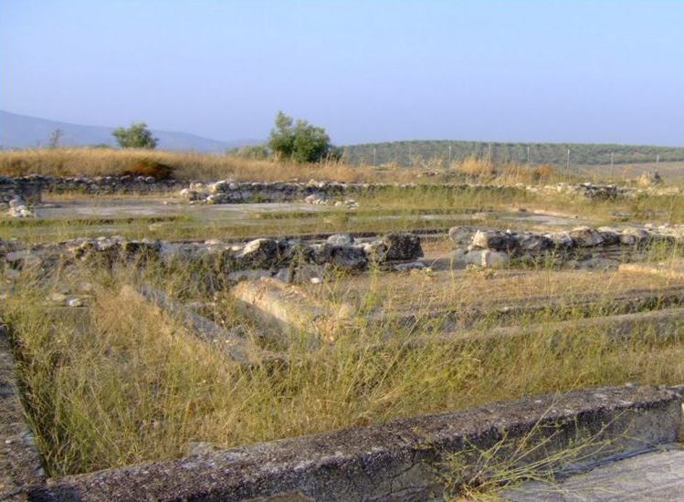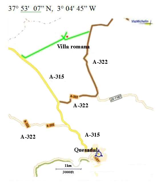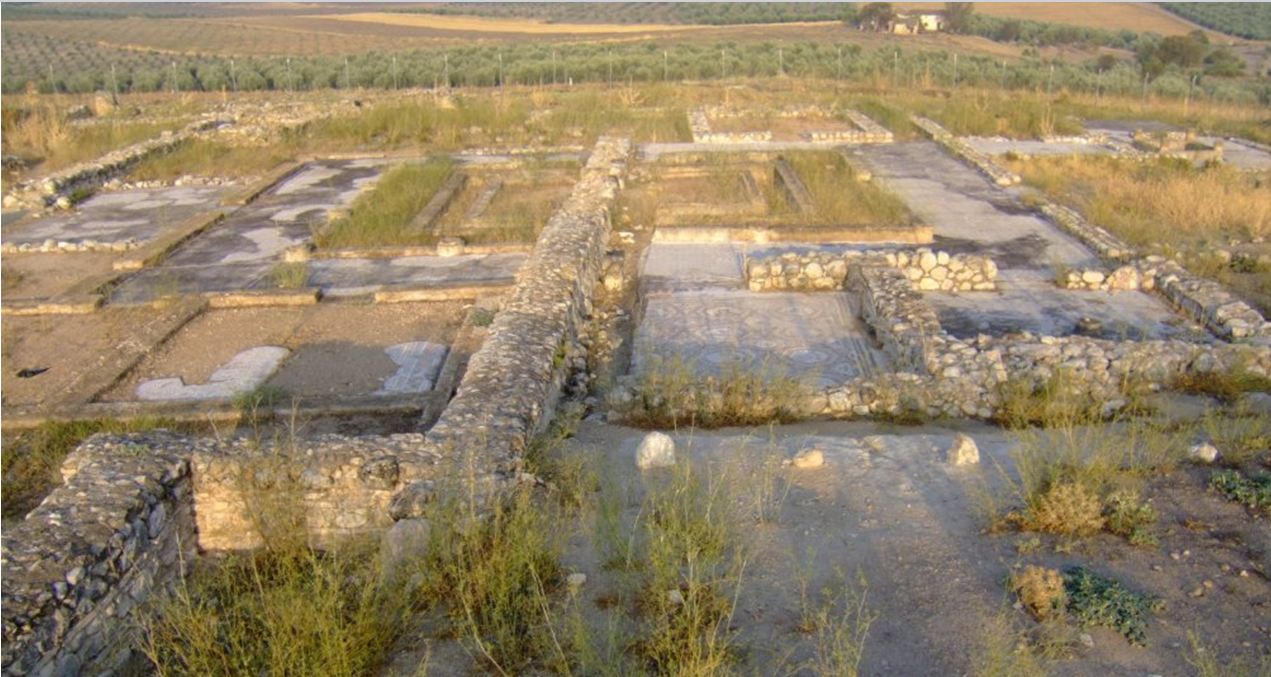 This villa, 5 kilometers north of the center of Quesada, was excavated in eight campaigns between 1965 and 1971, and had multiple phases of construction. The north end of the villa appears as a normal peristyle villa. Directly across the middle of the peristyle and its garden, a mighty wall slices slices the peristyle in two halves running east-west. Beyond the wall, the peristyle and garden continue. But the east-west wall turns out to be the north side of a vast double-apsed hall, which is followed, further south, by another villa wrapping around a large courtyard with covered galleries on all four sides, while off to the southeast, there is another peristyle with garden, porticoes, and surrounding rooms.