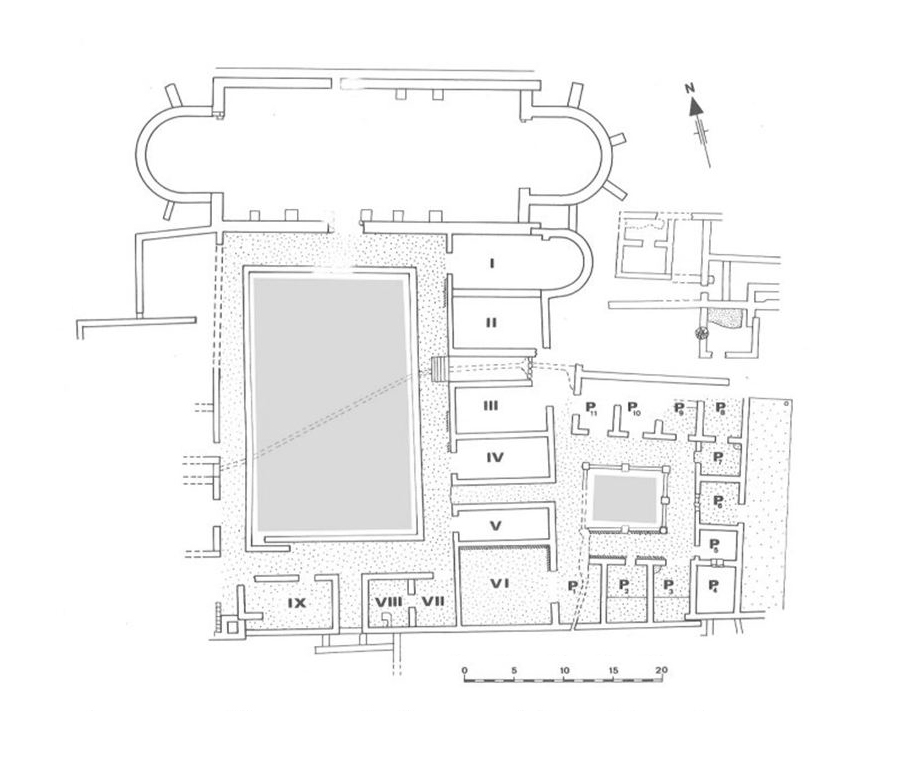 At some time in the fourth century AD, the southern half of this house was demolished to make way for the constructions of the third phase. The enormous court (46.7 x 13.6 m) with apses at each end lay along the north side of the new construction.