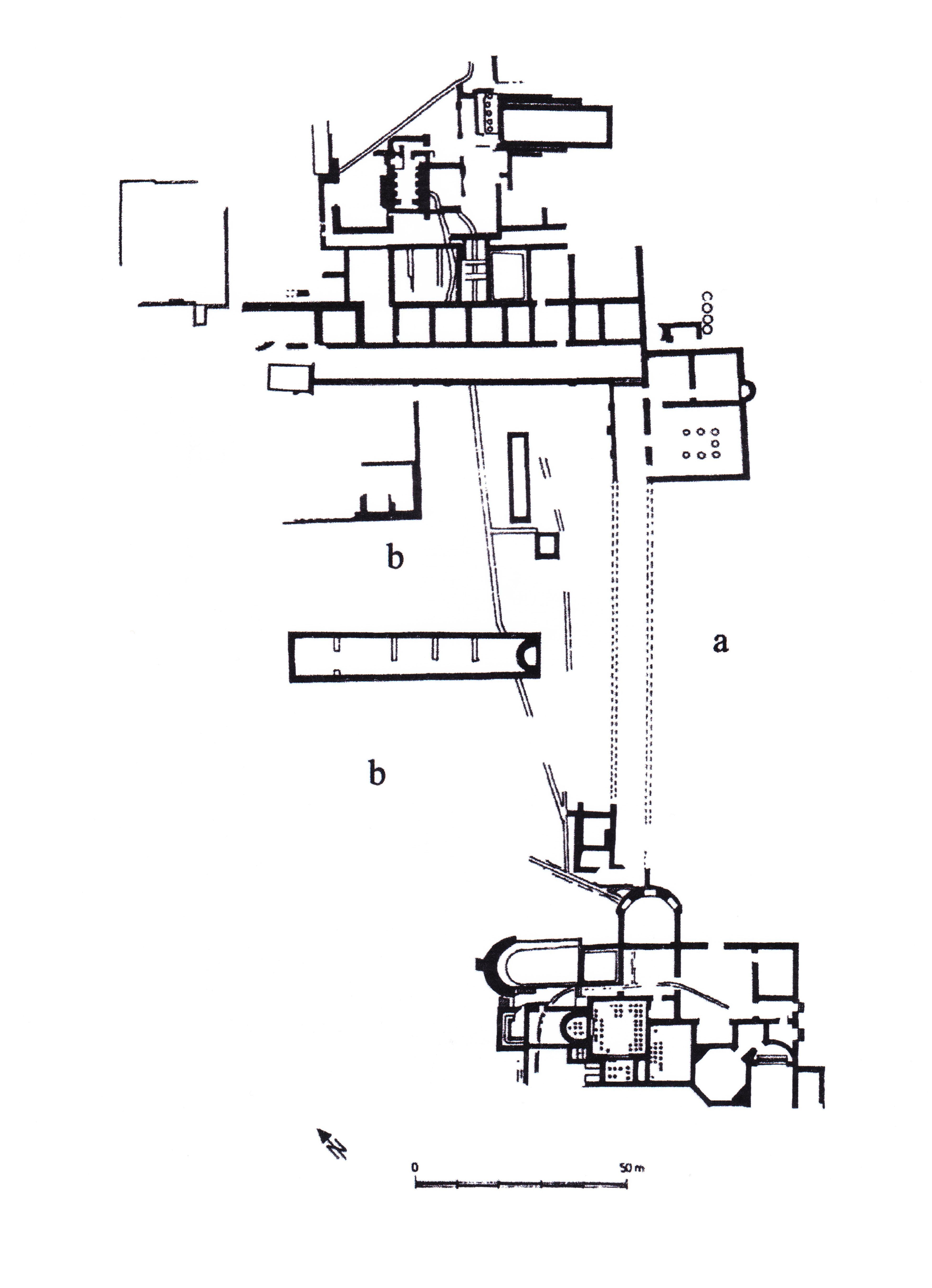 Across the front of the house on the side by the sea ran a portico [1] in a northwest-to-southeast direction to offer the best view. The garden lay between this portico and the sea. The excavator judged the area to be a garden, and his view is supported by several pools and perhaps a nymphaeum in the area. Also, at its southeast end, the portico turns and runs towards the sea. Opening onto this arm was a reception room with seven octagonal fountains arranged in a U. This room thus faced the garden and a pool rather than the sea. The portico was extended by a walkway and steps which defined the edge of the garden and led down the hill to a large bath complex added in the fourth-century rebuilding.