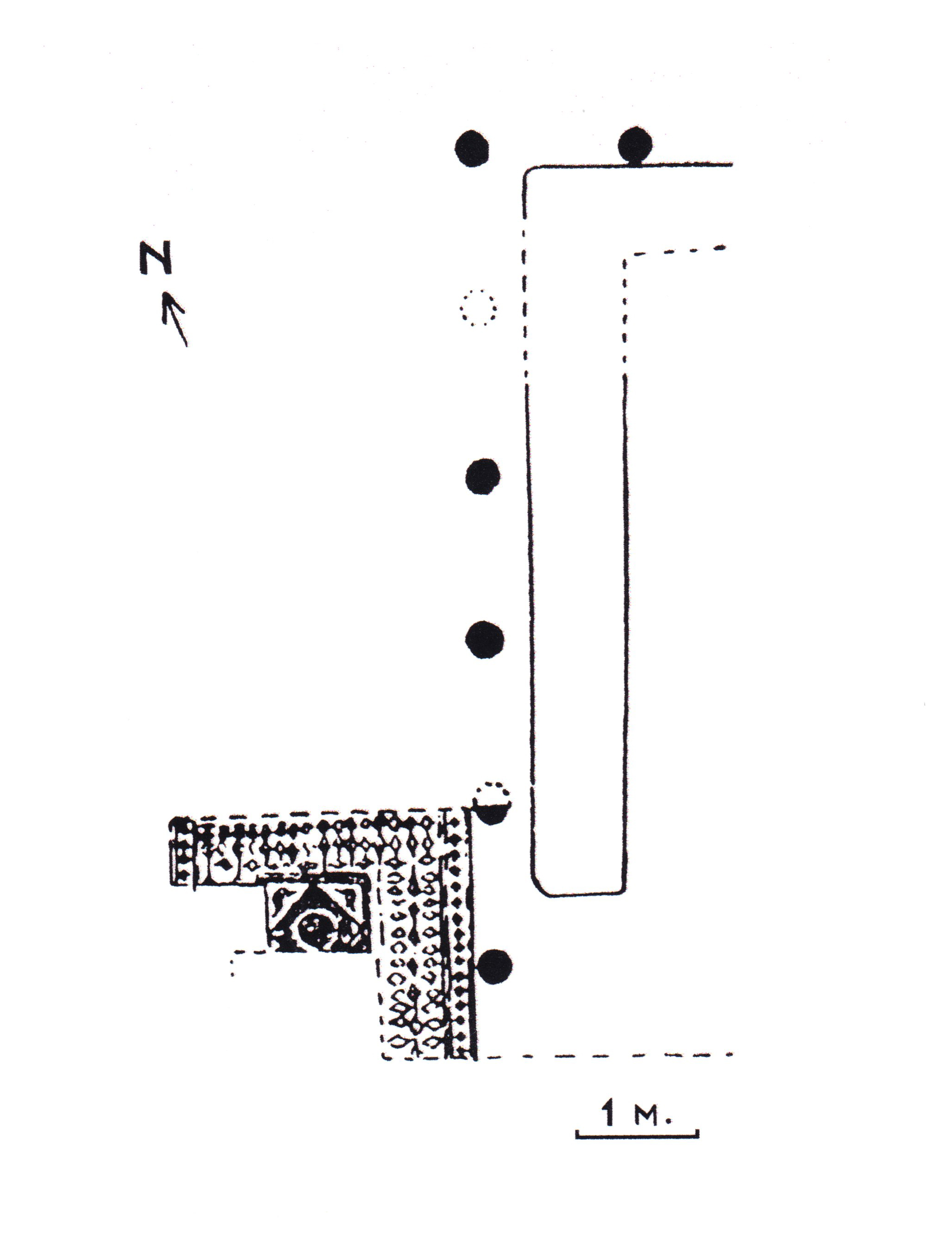 Excavations in the late 1940s and 1950s brought to light the remains of an urban house. Among the structures identified was a peristyle. The presence of a fountain and the existence of a dividing screen, or pluteus, caused Balil to assert that the house must have contained gardens. Two porticos were identified, a larger one in which six columns were recovered (a) and a smaller one with two columns (b). In the center of the larger portico was an L-shaped nympheum or fountain. A lively mosaic in the southwest corner dates the house to the beginning of the second century. Each porticus may have contained a garden.