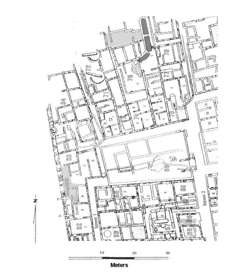 This house in the northwest corner of Neapolis backs onto the edge of the city, against the western wall. It had gardens or terraces on its outside edges.