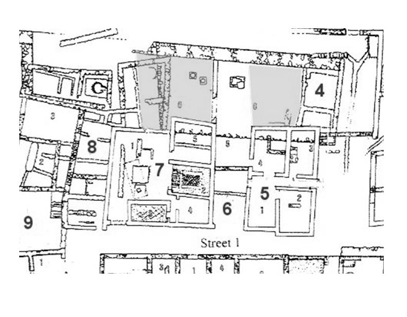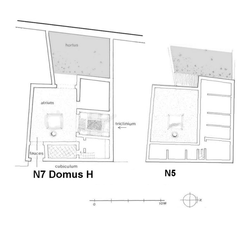 These two adjacent houses are typical Tuscan atrium houses, both are against the western city wall, and both have gardens of some 50 square meters at the back of the house (Fig. 1). In Pompeii, Jashemski found many small, non-peristyle gardens in modest homes. Few have been found elsewhere, probably because they were in cities and most ancient cities are under modern ones. This example of two side-by-side is therefore particularly noteworthy. Mar and R. de Arbulo, in their comprehensive volume on Emporiae, give two somewhat different versions of House N5, one on page 366 and one on the foldout map in the pocket at the back of the book. The main differences, however, are in the interpretation of the walls and spaces on the inside of the house and do not affect the interpretation of the garden areas.