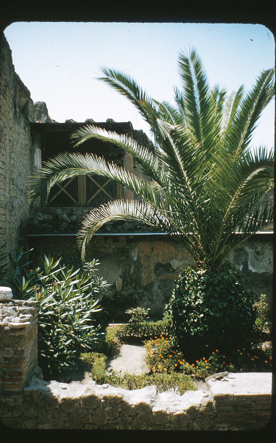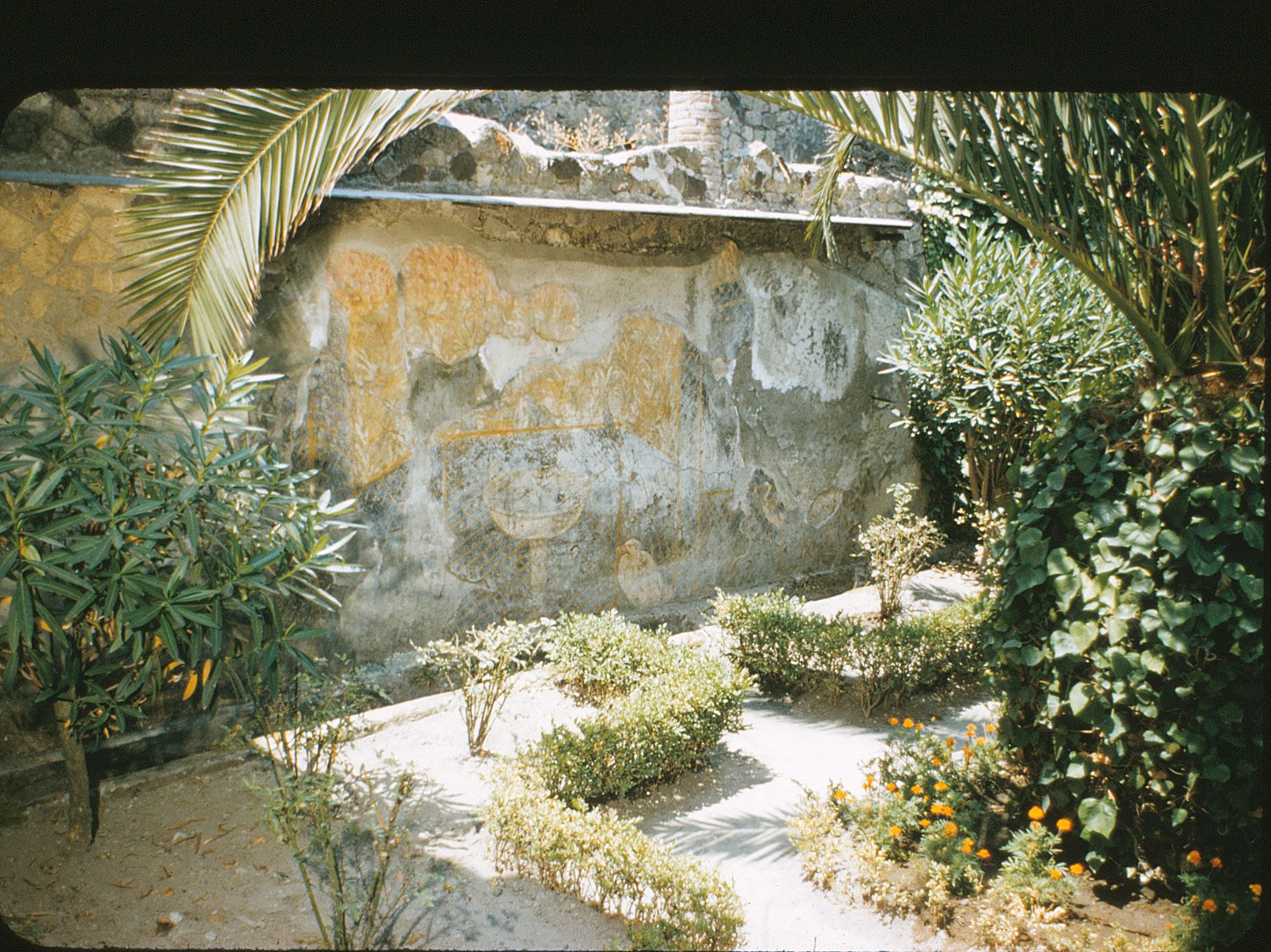 537.III.11. Casa del Tramezzo di Legno The excavation of this house was begun in 1869-1875, but the excavation of the garden and restoration of the house was completed in the time period from January 1928 to December 1929. A wide opening on the west offered a view of the garden from the triclinium(b) directly across the way. A narrow storeroom (c) on the south had a small loggiasupported by slender columns overhead which provided a view down into the garden. The south garden wall was decorated with a garden painting. A combination of the painting's poor condition and the artist's strange sense of perspective caused difficulty ininterpretation. The typical lattice fence would appear to recede to form an apse for the fountain, however the lattice is painted over the fountain, a robust bowl-shaped affair, making it appear neither in front nor in back. An arbor was perhaps included,but the plaster was extensively damaged in this area. The birds were unusual, a small light colored bird perched on the right rim of the fountain was unable to be identified and on each side of the fountain at the base was a large sleepy duck (Anas sp.).A small slender heron on the right is picking at a snake. Beyond the fence various indistinct shrubs are painted on a yellow background. Between the two east pillars of the north wall the cisternmouth received water collected by the gutter which ran around the perimeter of the garden.