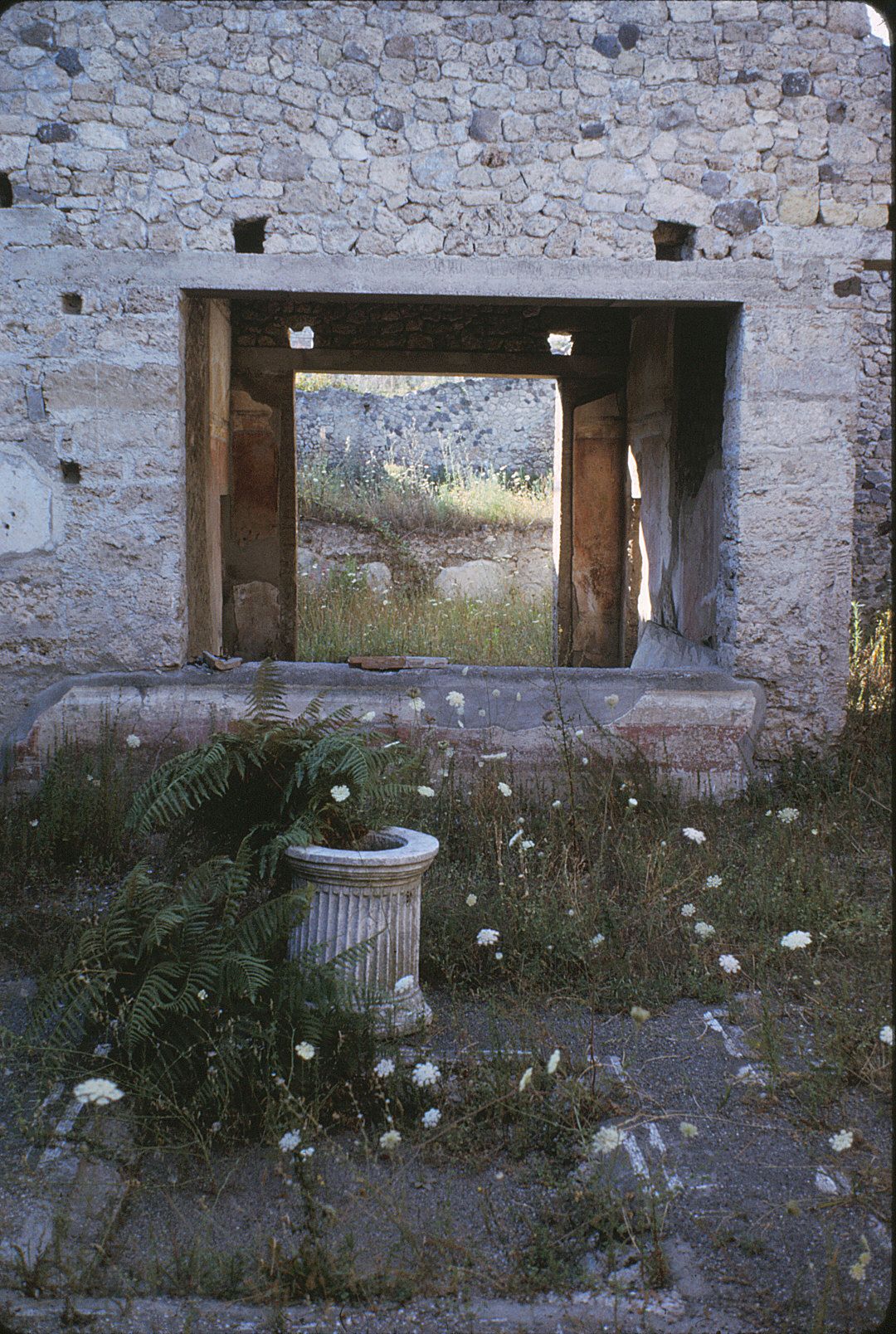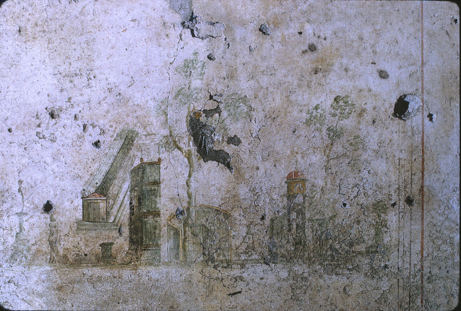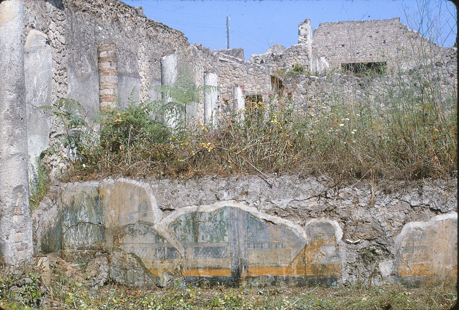 The natural rising slope of the land made this long upper garden (a) at the rear of the house visible from the entrance at the south. A side door on the west wall to the rear offered access to the garden through a colonnaded portico. Garden paintings adorned the retaining wall that separated the upper garden from the rest. Fig. 3. These rather crude images were visible from the atrium through a window in the tablinium. Fig. 4. The paintings were divided into three panels on the retaining wall by wide black bands and they continued along the short extension of the wall on the west above the small basin that was built in the corner. Jashemski reported that the west panel was the best preserved when she examined it in 1968. She recorded seeing from left to right starting over the basin, a few oleander bushes and a date palm. A lattice fence begins at the basin and above that there was evidence of more oleanders, some with red blossoms and a bowl-shaped footed basin with a large bird perched on the rim on the left, (the plaster had fallen away with the right side of the rim). Following were more oleanders, a date palm and a cattle egret (Bubulcus ibis L.) perched on the fence with more oleanders behind. More than half of the center panel did not survive, but here the fence is solid, rather than lattice, and encloses a pool, although the right section of the pool is missing and the remaining part are barely visible. It appears that a sphinx was represented on the top of the left end of the fence. Jashemski remarks that this panel had the characteristics of a garden representation. A garland is painted along the base of the fence in both panels. The last panel had nothing but faint traces of images surviving. A garden representation was painted in the center of the large middle panel of the east wall of the triclinium (b). It is a simple rendering painted in yellow of a lattice fence enclosing a garden with an apsed niche in the center of the front and back. To either side there is an angular niche, four total, and eight tall posts rise from the corners and on either side of the apsed niche in front. The two front posts have ornamental vases on top. The west wall had a similar representation. Fig. 5. The excavation took place in 1951-52 and among other objects found were four small marble fountain statues of amorini sliding down the backs of dolphins (0.33-0.40 m. high; Pompeii inv. nos. 8126-8129.)