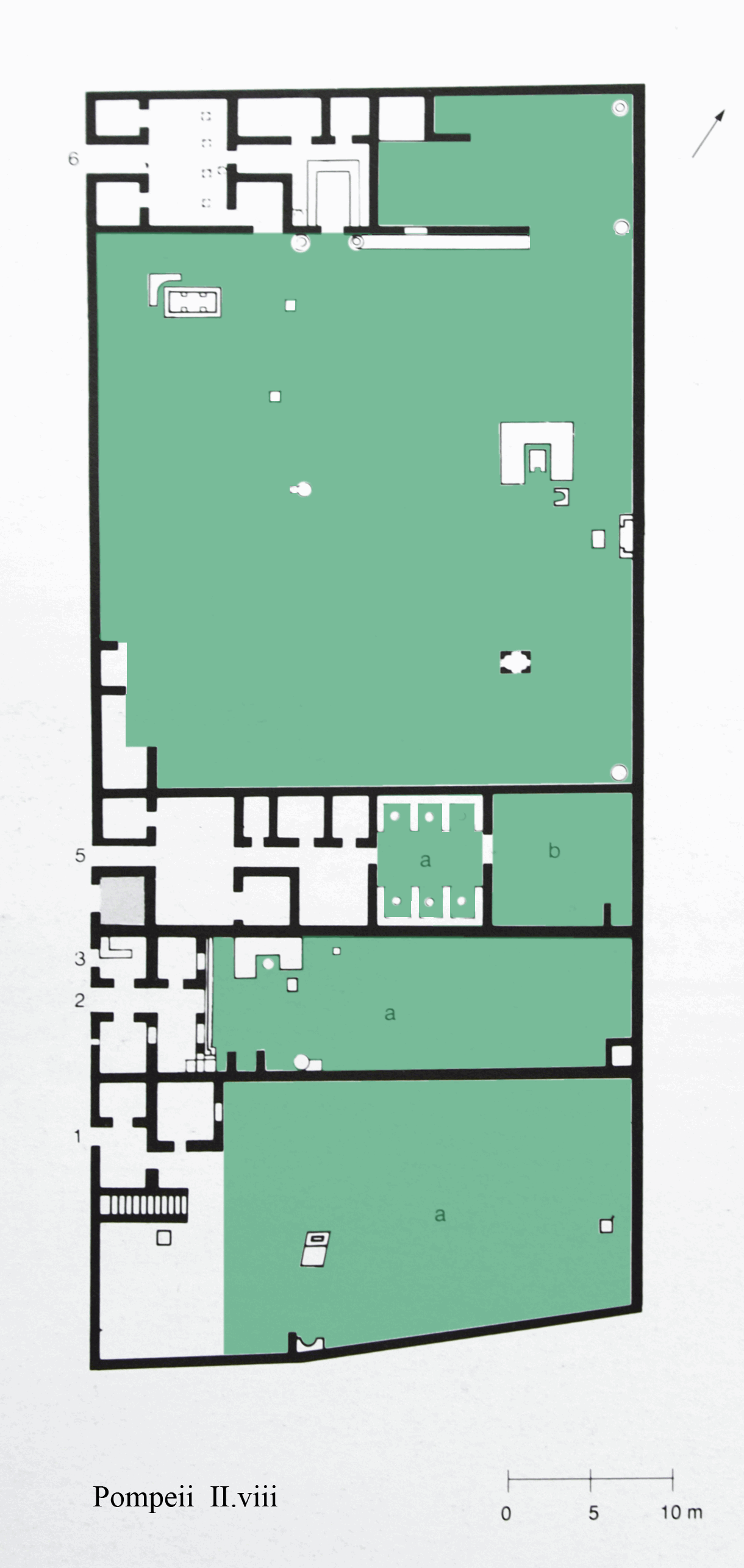 A. A very small bath was located at the left rear of the atrium in this unusual building. Behind this was a tiny garden (a) with three small triclinia on either side. The couches of these six triclinia were so low and narrow they must have been used as seats similar to the taberna attached to the house of Julia Felix, II.iv.7.
