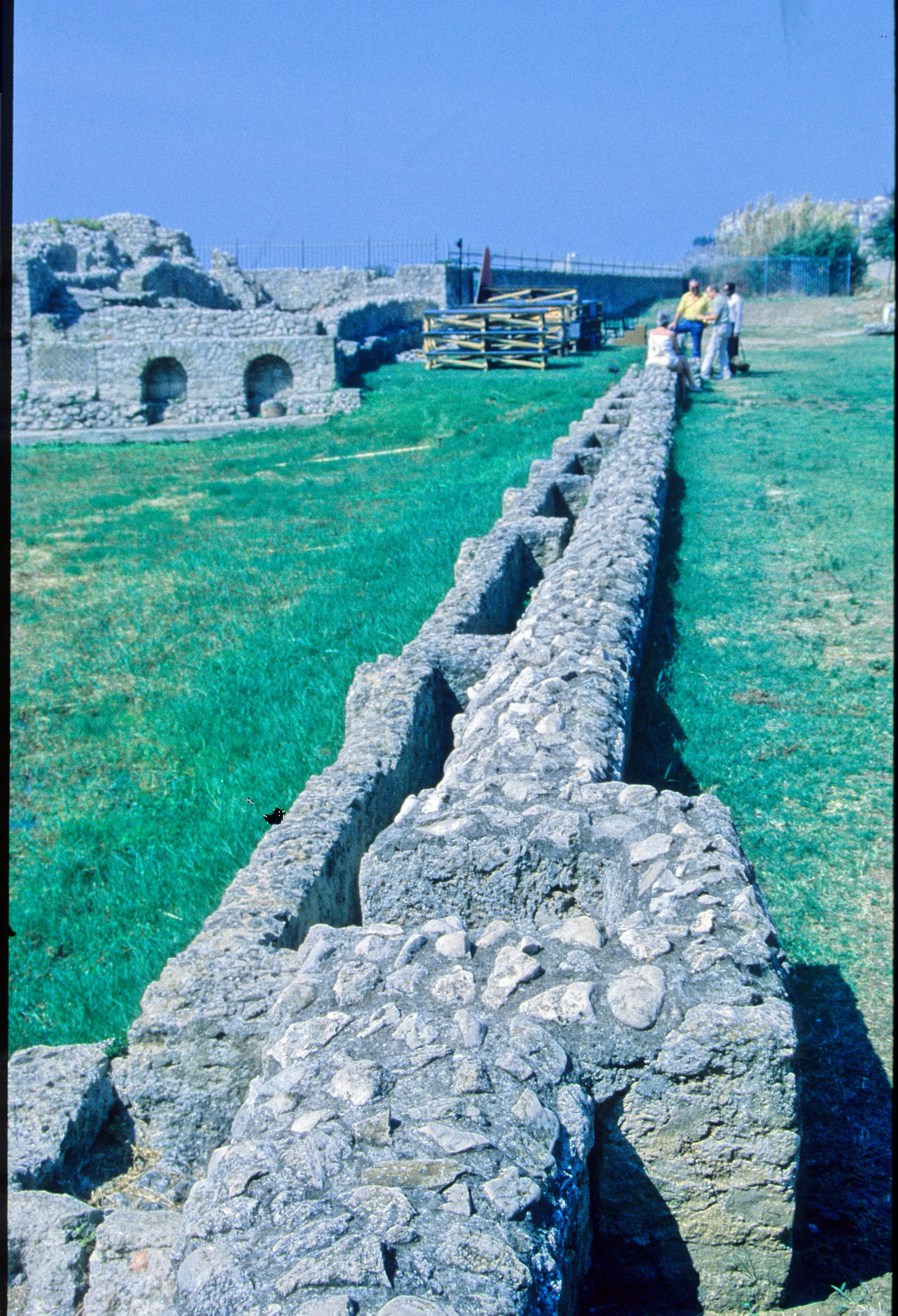 These parts of the villa have been relatively spared and they are among the best features of this maritime residence (SALZA PRINA RICOTTI 2002). As a matter of fact, also when the peristyle garden was flourishing, it could never have been as impressive as this imposing cryptoporticus and its underlying terrace (Fig. 93, B), beautiful places to stroll and admire the glorious sunset. The combination of a cryptoporticus and a terrace to create a new kind of garden, was already present in Roman architecture. We can see it depicted in the Pompeian frescoes and we find it in other seaside villas. For instance this kind of open-air arrangement was extensively described in a letter in which Pliny the Younger pointed out the highlights of his cherished Laurentine villa to one of his friend (PLIN. epist. 2.17). In Sperlonga as in Pliny's terrace, a narrow border of flowering plants was set against a low masonry wall, a parapet which was necessary to protect the vegetation from the salty sea breezes (Fig. 94). Today, the fact that bunches of blossoms existed there is confirmed by the presence of a watering system which started from some spring set high on the overhanging hill. We can follow the trace of a groove cut in the rock coming down to the fishpond's northeastern bank. From the piscina side, through a canal (Figs. 91, S; 96), the water was led up to the low parapet of the terrace (Fig. 97), and here, turning at a right angle, it ran all along it. At regular intervals, a series of drain wells helped to draw the water and irrigate the plants. Their presence confirm that a flowerbed existed there and that it was set against the wall.