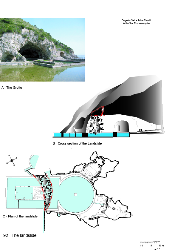 Sperlonga is a maritime villa built at the end of the Roman Republic. It probably belonged to some very rich piscinarius, one of those extremely wealthy Roman patricians who took delight in creating their own fish ponds. The purpose might have been to always find fresh fish at their disposal, or, at least, so they said. Actually those Tritones piscinarum, as Cicero called them (CIC. Att. 2.1.6; 2.9.1), considered their piscinae more a status symbol than an industrial operation, and cherished their fishes more as pets than as tasty tidbits (VARR. r. r. 3.17.3). Sperlonga, with its lavish decoration and its luxurious setting, was built by one of these tycoons. Built, yes, but by whom? When, in the middle of the last century, this villa was discovered, some scholars decided that it must have been Tiberius. Actually the only connection we could establish between the ancient emperor and this place is the fact that he nearly died while dining in the villa's colossal nymphaeum. At this time he was traveling from Capri to Rome and stopped at Sperlonga to rest. We read that he was there, on a small island set at the center of the fishpond, laying with his friends on mattresses placed around an elegant water triclinium (Fig. 91, A) set on a small island at the center of the fishpond. They were drinking, chatting and enjoying the splendid view of the statuary groups displayed in the nymphaeum when the entrance of the grotto crashed down in a historical landslide reported by both Suetonius (Tib. 39) and Tacitus (ann. 4.59) (Fig. 92). I can't imagine how this unfortunate dinner could place Tiberius as the owner and the creator of the spectacular grotto. However this is what some scholars assert and they still believe it. I can't agree. For one thing we know that Tiberius disapproved of luxury. In Tacitus (TACITUS) we find the transcription of some of his speeches to the senate and we notice how harshly he attacked all the people who built luxurious villas and bought expensive statues to put in them. How could Tiberius censor his fellows countrymen for purchasing some marble copies of goddesses and heroes, while he himself was importing from Greece those monumental Hellenistic groups, and setting them in the seaside grotto of a more than sumptuous maritime residence? It was not logical, and for this reason we feel quite certain that Tiberius had no part in creating the Sperlongan art display. However, are we sure that the villa didn't belong to the imperial praedia? No, we can't even deny this: Sperlonga could have entered Augustus' estate through a legacy. As a matter of fact we know that, on their death, many rich men used to leave their property to the emperor. Some of these tycoons and also some relatives of the Julio-Claudian family could easily have done this. We can't even forget that - as reported by Cicero (CIC. I cent. B.C.) - Philip, Augustus' stepfather, was one of the most important and rich piscinarii of the I cent B.C. Apart from this we can't say anything more.
