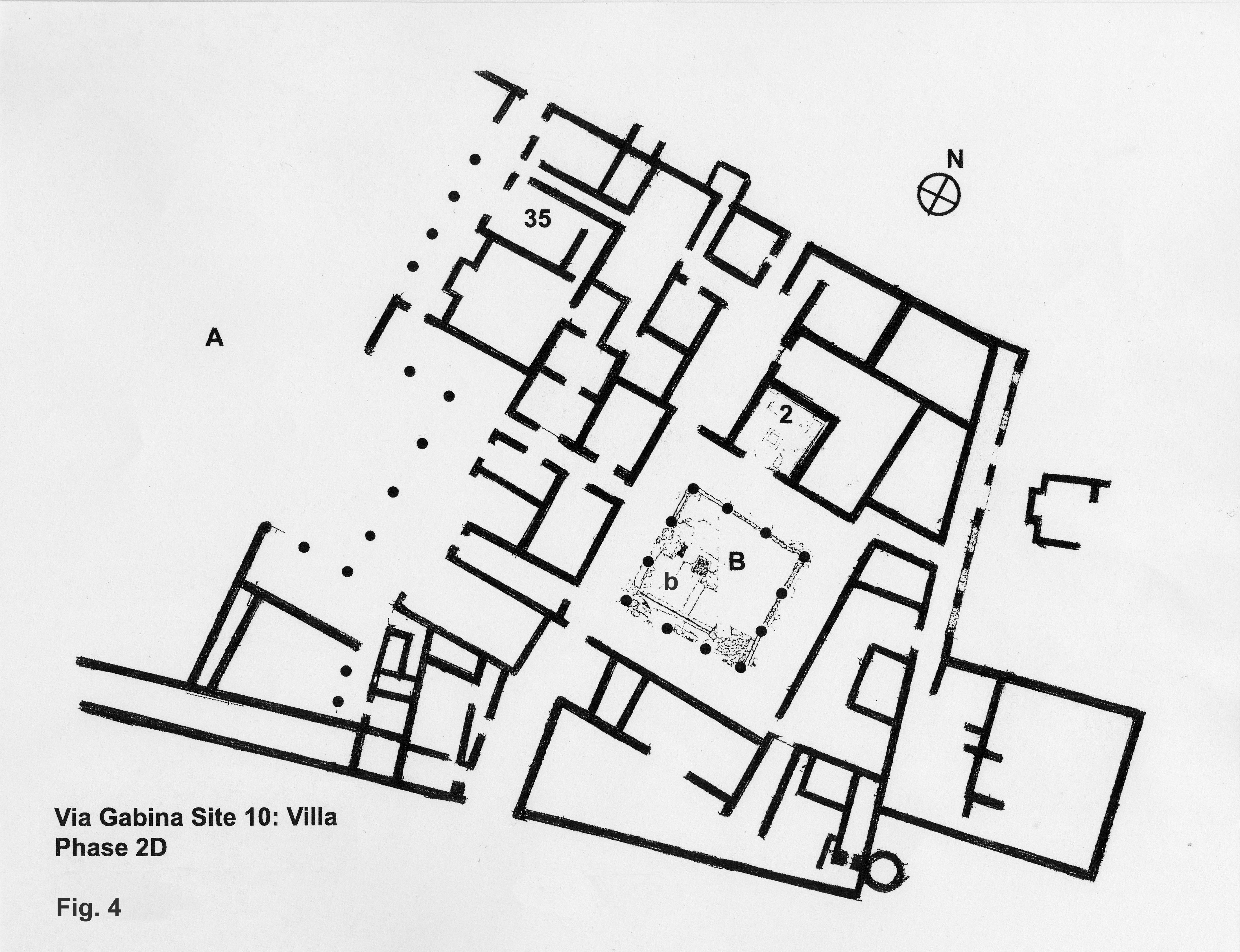 The villa had a western enclosed garden area (Figs. 4 and 5) framed on the east by a Doric loggia at least from the time of Domitian. It was then that the owners created an elaborately decorated triclinium (Fig. 4, "35") overlooking the garden and affording a view back to Rome (thus setting up the contrast of the serenity of the country with the congestion of the city). This was a major addition to the villa/residence. Phase 2D extended the loggia and gave a greater sense of symmetry to the facade. No pool of any depth was possible because the space of the garden overlaid bedrock-cut chambers for the fermentation of wine. Again, there could be no determination of specific planting; not even flotation material was helpful. It was in this western garden area that a huge horreum/barn was constructed in the late 4th or early 5th century C.E.