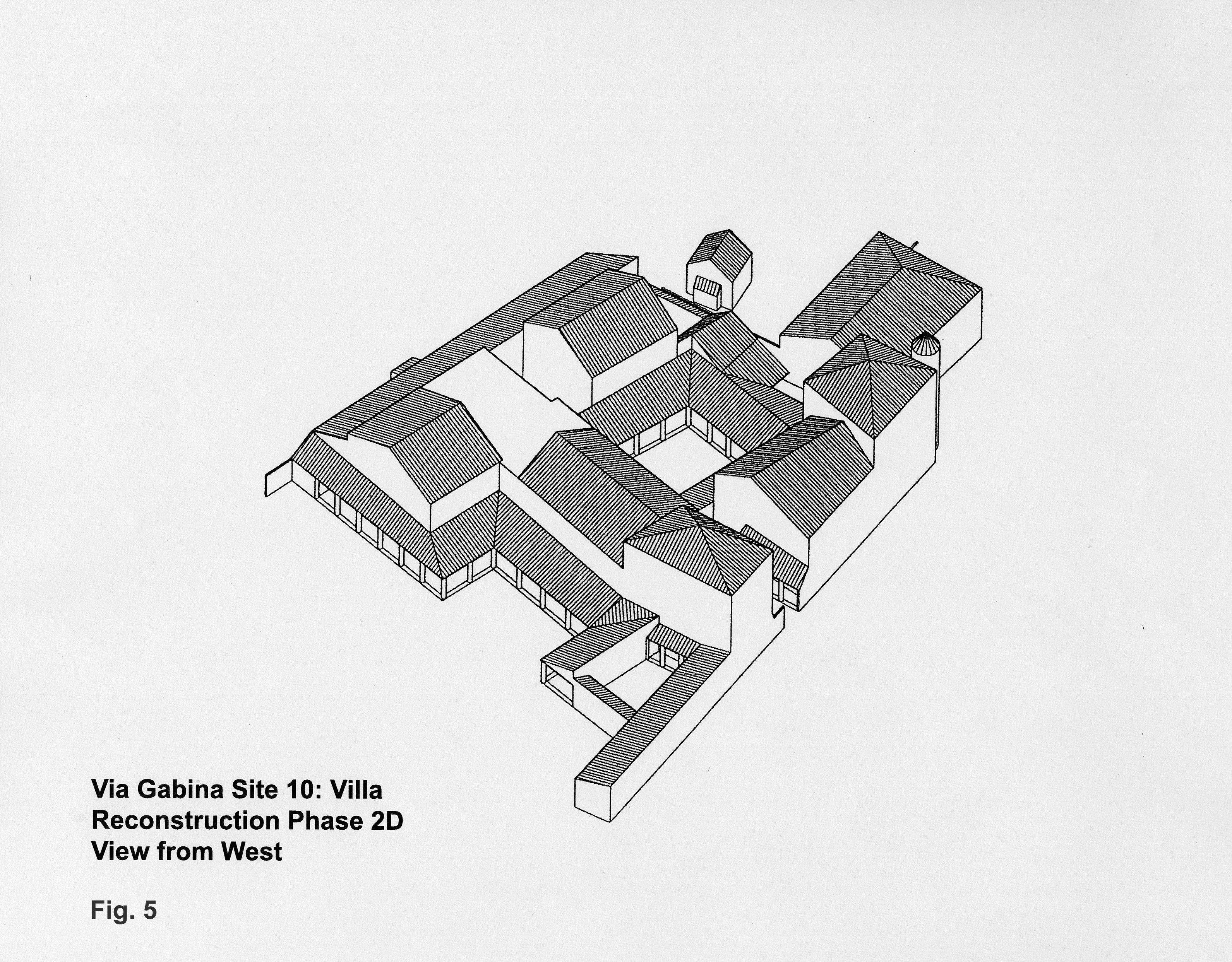 This large complex villa structure was founded in the Augustan period and was abandoned in the early 3rd century A.D, with evidence from pottery of continued occupation that time. Not even the peristyle core of the plan could be dated to what we call Period 1 (the early occupation period of the Via Gabina sites). Pottery, roof tile stamps, and construction technique (revetted concrete) all give four phases to the villa remains – Augustan, Julio Claudian, Domitianic, and Hadrianic. Reconstructions have been accomplished for all the phases of Period 2, but what interests us here with our focus on gardens is the last or Hadrianic phase (Phase 2 D – Figs. 4 and 5).