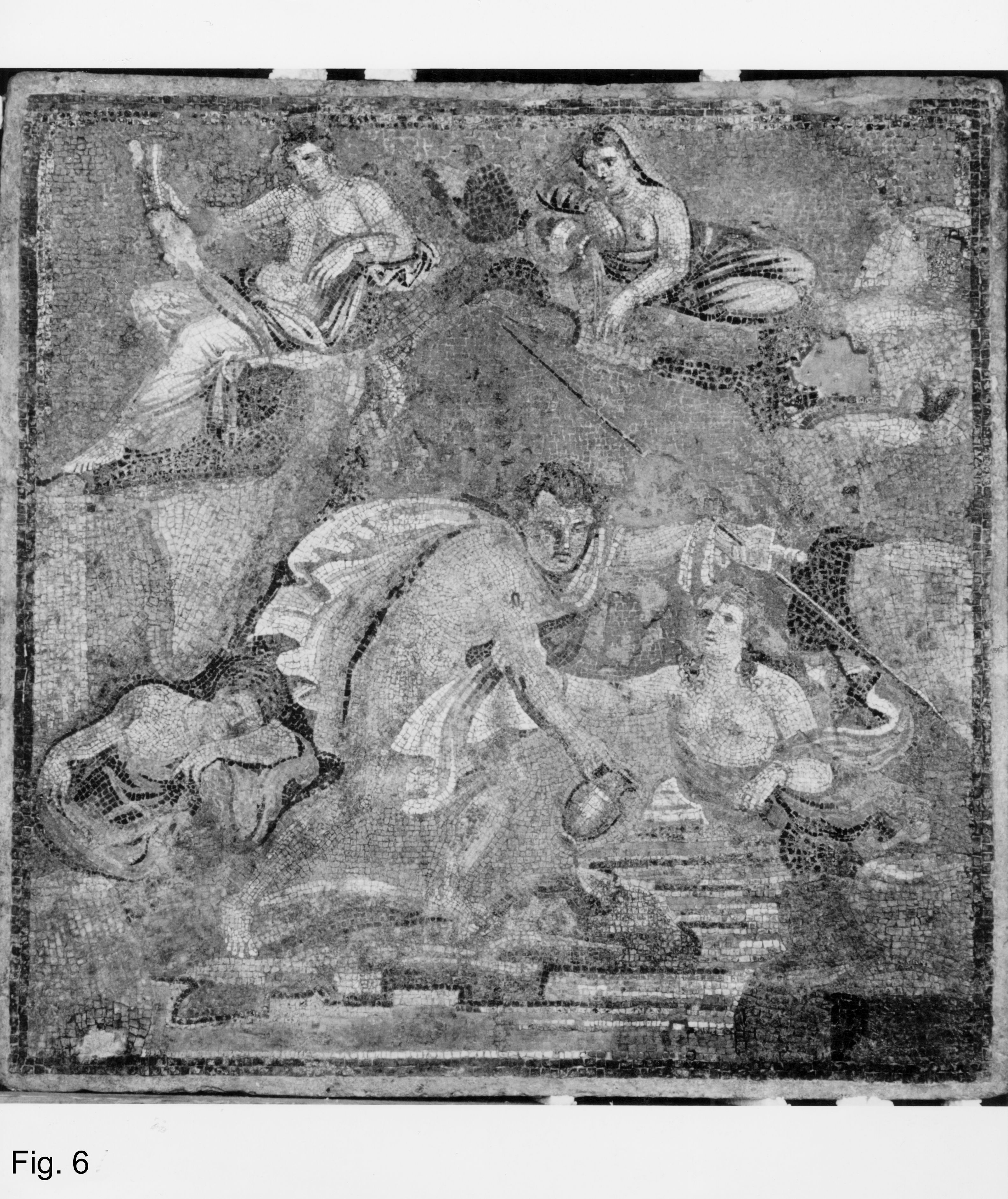 2.B. The peristyle garden of Phase 2D (Figs. 4, "B" and 5) dates from the Augustan core of construction (Phase 2A). Overlooking the peristyle center through a wide double doorway was an oecus or reception/dining room (Fig. 4, "2") with an emblema (59cm x 59cm) at the center of its mosaic floor. The emblema (now on permanent exhibition in the Palazzo Massimo alle Terme di Museo Nazionale Romano) portrays "The Rape of Hylas" (Fig. 6). This depiction was found in situ and oriented to be seen to best advantage from the couch of the padrone or distinguished guest at the back of the room. The location of the couch was indicated in the design of the black and white mosaic surrounding the emblema – unfortunately the Museo Nazionale's restoration has reversed this relationship by turning the emblema so it would be read in proper perspective from the door of the oecus and not the couch). From bedrock cuts (Fig. 4, "b") and a nearby well, it would seem the pool and grotto into which Hylas was abducted was emulated in the open area of the peristyle garden. Hence a view from the principal couch first of the graphic depiction of the rape and then a simulation of the place it occurred. The iconography involved in this sequence and subject relates to the agricultural function of the villa itself and its bucolic character. Because the emblema consists of a single tile containing the tiny tesserae (therefore portable) and can be dated to the beginning of the 1st century B.C., it may well be that the emblema was also an embellishment of the Period 1 villa.