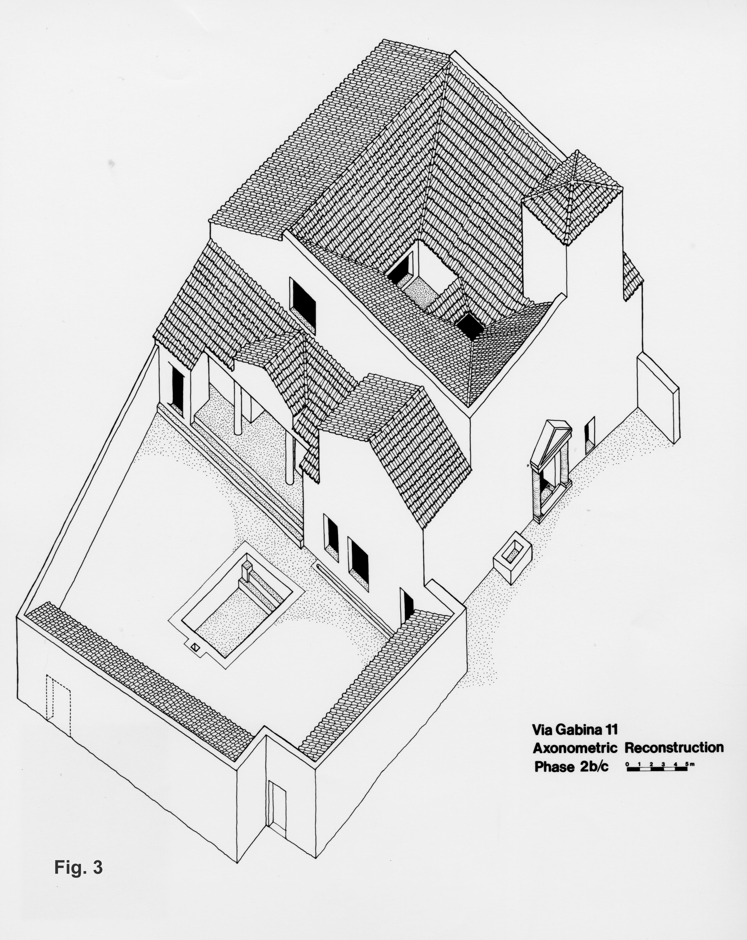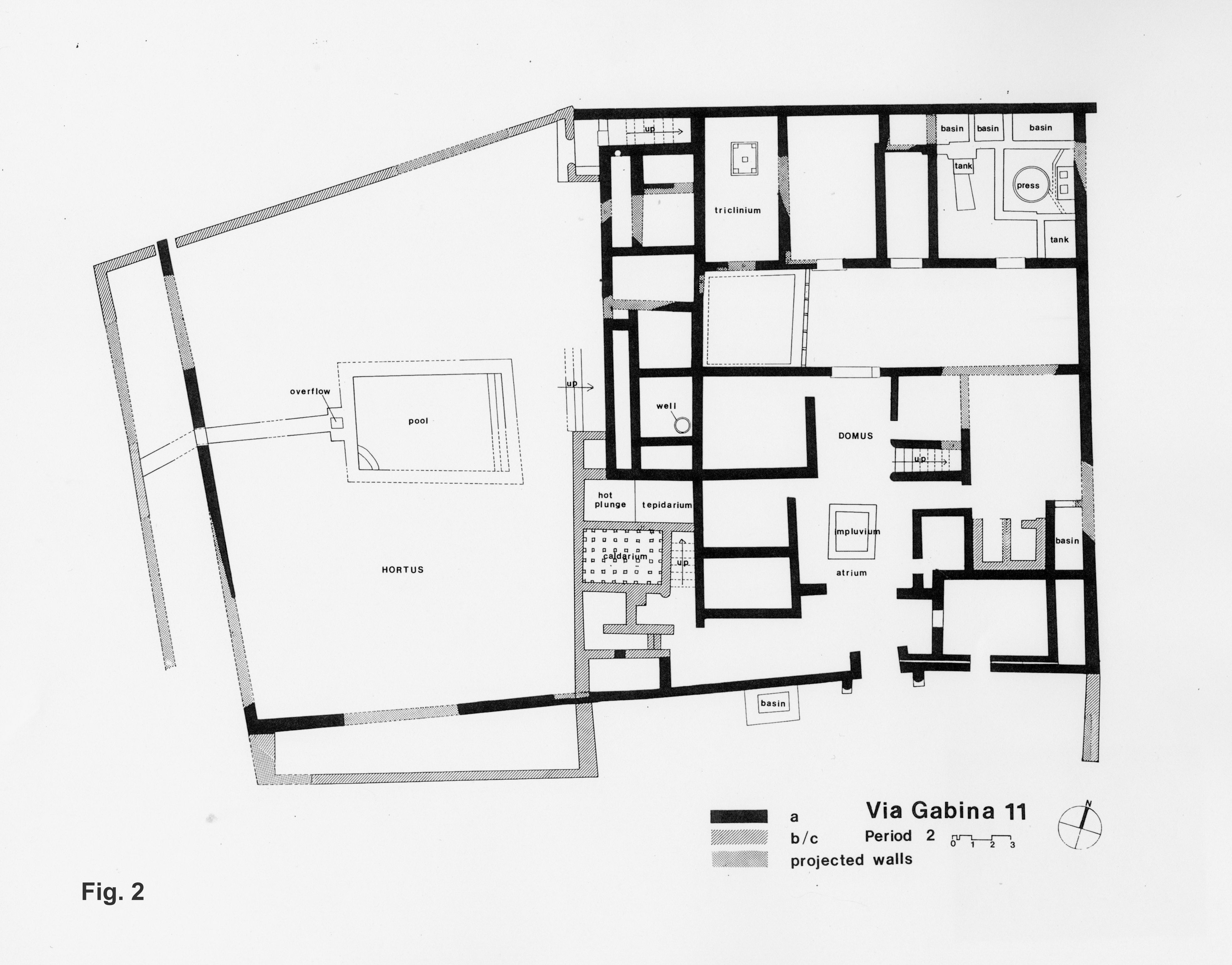 This villa at Site 11 was a simple "U" plan farmhouse initiated at the beginning of the 3rd century B.C. (Period 1). In the Augustan Age this farmhouse was transformed into a more luxurious atrium type villa/residence (Period 2 – Figs. 2 and 3). During the reign of Trajan a bath suite was added as well as an outside plunge pool in what seems to have been a western enclosed garden (hortus) from as early as Period 1. Because of the proximity of bedrock and the fact the slight earth cover had been ploughed for centuries, any evidence of what might have been planted in the garden had long since been destroyed. We know, however, that there must have been surrounding olive groves from the press facilities of the villa, also dating from the time of Trajan. All was abandoned in the second or third decade of the 3rd century of the Christian Era.